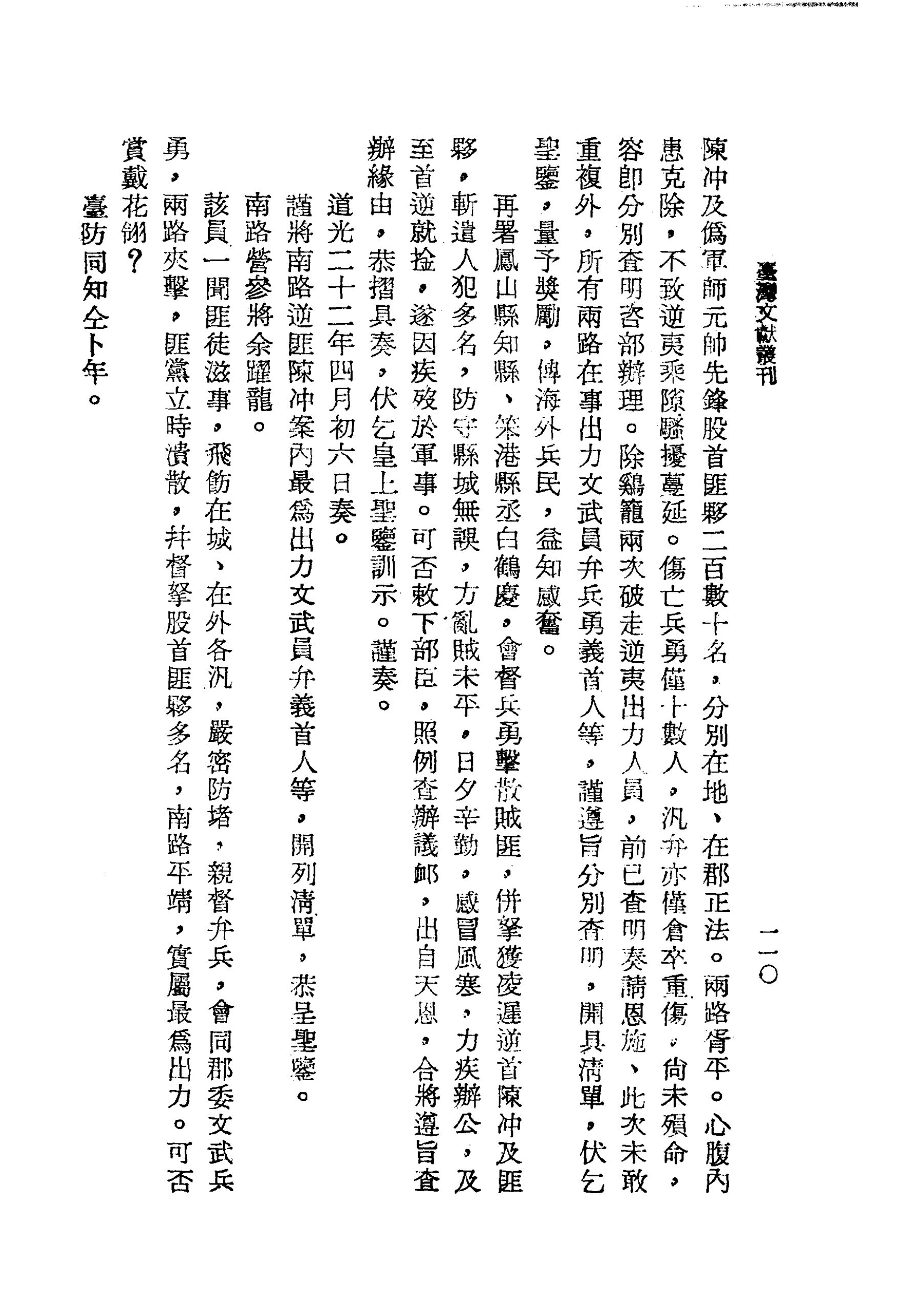 再署鳳山縣知縣、笨港縣丞白鶴慶,會督兵勇擊散賊匪,併拏獲凌遲逆首陳沖及匪夥,斬遣人犯多名,防守縣城無誤,方亂賊未平,日夕辛勤,感冒風寒,力疾辦公,及至首逆就捦,遂因疾歿於軍事。