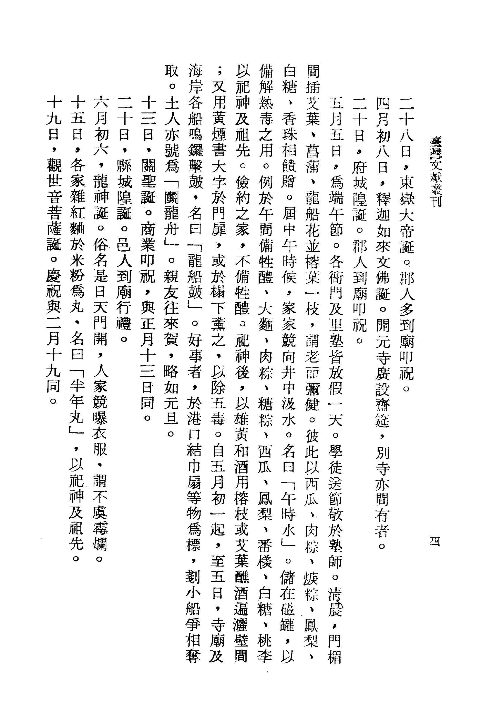 五月五日,為端午節。各衙門及里塾皆放假一天。學徒送節敬於塾師。清晨,門楣間插艾葉、菖蒲、龍船花並榕葉一枝,謂老而彌健。彼此以西瓜、肉粽、糖粽、鳳梨、白糖、香珠相饋贈。屆中午時候,家家競向井中汲水。名曰「午時水」。儲在磁罐,以備解熱毒之用。例於午間備牲醴、大麵、肉粽、糖粽、西瓜、鳳梨、番檨、白糖、桃李以祀神及祖先。儉約之家,不備牲醴。祀神後,以雄黃和酒用榕枝或艾葉醮酒遍灑壁間;又用黃煙書大字於門扉,或於榻下薰之,以除五毒。自五月初一起,至五日,寺廟及海岸各船鳴鑼擊皷,名曰「龍船皷」。好事者,於港口結巾扇等物為標,剗小船爭相奪取。土人亦號為「鬬龍舟」。親友往來賀,略如元旦。