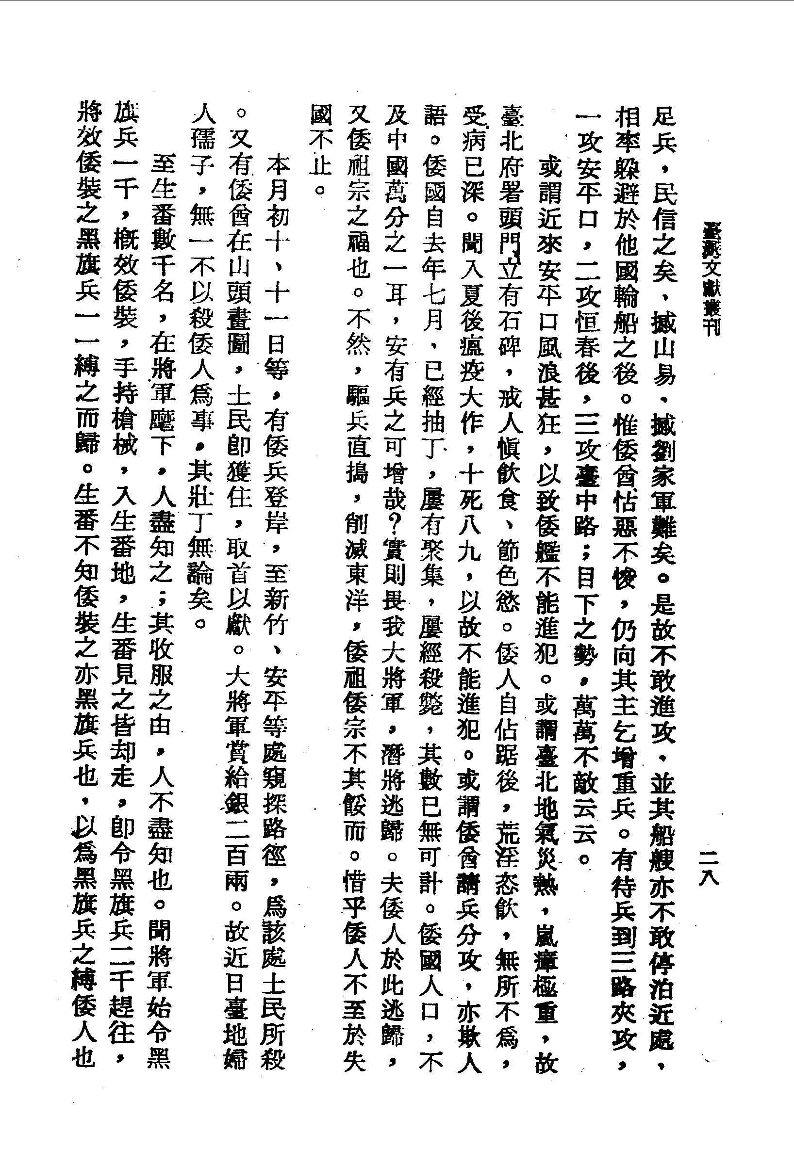 或謂近來安平口風浪甚狂,以致倭艦不能進犯。或謂臺北地氣災熱,嵐瘴極重,故臺北府署頭門立有石碑,戒人慎飲食、節色慾。倭人自佔踞後,荒淫恣飲,無所不為,受病已深。聞入夏後瘟疫大作,十死八九,以故不能進犯。或謂倭酋請兵分攻,亦欺人語。