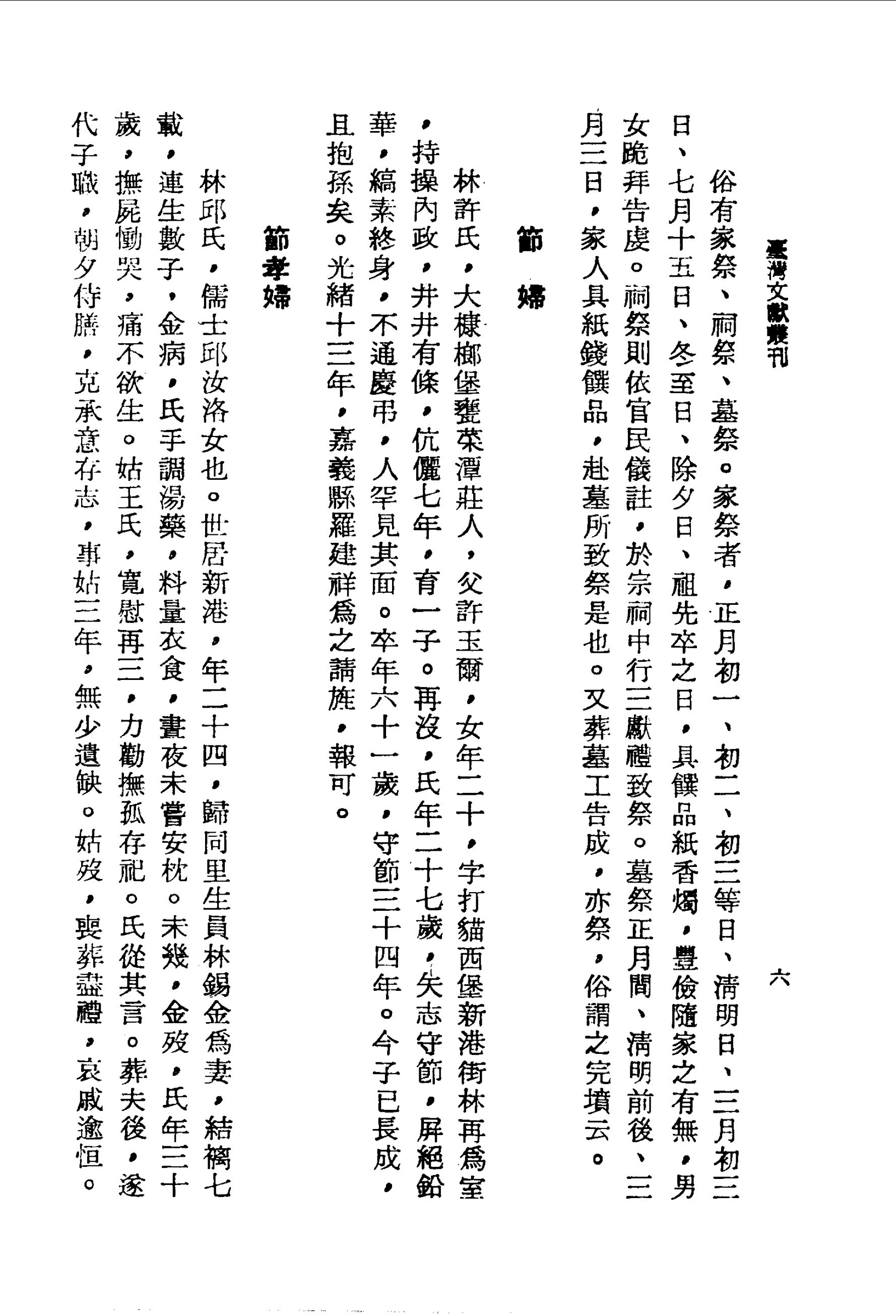 林邱氏,儒士邱汝洛女也。世居新港,年二十四,歸同里生員林錫金為妻,結褵七載,連生數子,金病,氏手調湯藥,料量衣食,晝夜未嘗安枕。未幾,金歿,氏年三十歲,撫屍慟哭,痛不欲生。姑王氏,寬慰再三,力勸撫孤存祀。氏從其言。葬夫後,遂代子職,朝夕侍膳,克承意存志,事姑三年,無少遺缺。姑歿,喪葬盡禮,哀戚逾恆。