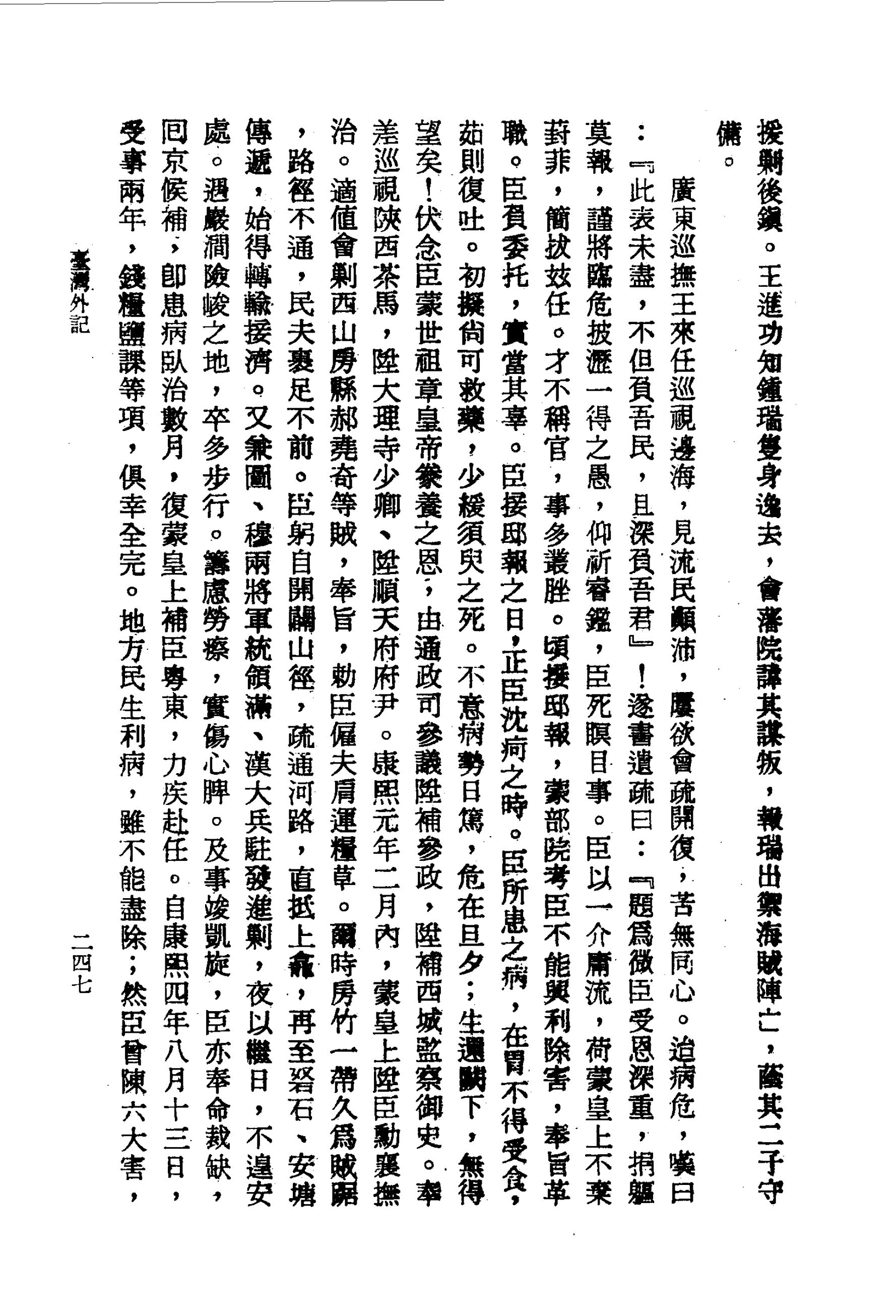 頃接邸報,蒙部院考臣不能興利除害,奉旨革職。臣負委托,實當其辜。臣接邸報之日,正臣沈疴之時。臣所患之病,在胃不得受食,茹則復吐。初擬尚可救藥,少緩須臾之死。不意病勢日篤,危在旦夕;生還闕下,無得望矣!伏念臣蒙世祖章皇帝豢養之恩,由通政司參議陞補參政,陞補西城監察御史。奉差巡視陝西茶馬,陞大理寺少卿、陞順天府府尹。