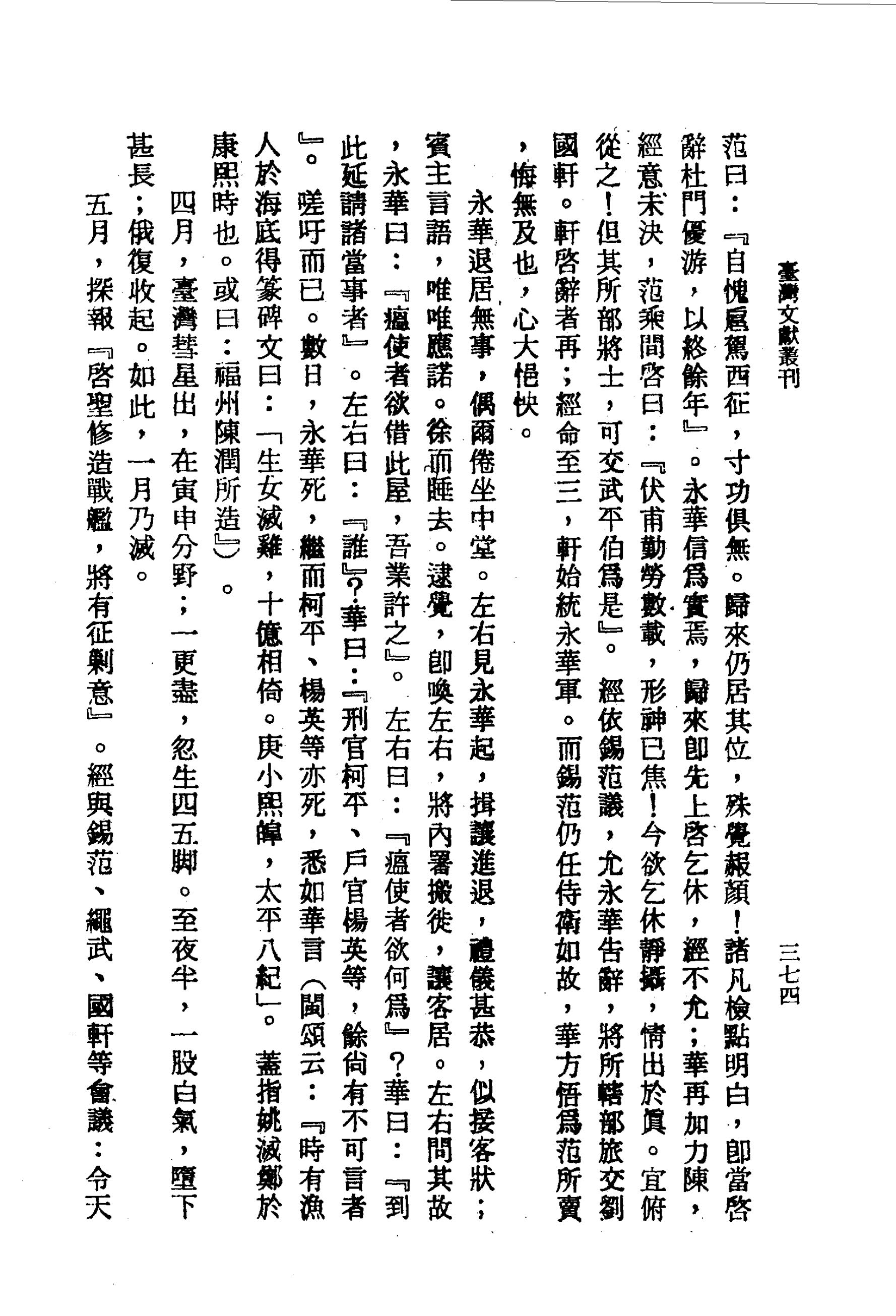 永華退居無事,偶爾倦坐中堂。左右見永華起,揖讓進退,禮儀甚恭,似接客狀;賓主言語,唯唯應諾。徐而睡去。逮覺,即喚左右,將內署搬徙,讓客居。左右問其故,永華曰:『瘟使者欲借此屋,吾業許之』。左右曰:『瘟使者欲何為』?華曰:『到此延請諸當事者』。左右曰:『誰』?華曰:『刑官柯平、戶官楊英等,餘尚有不可言者』。嗟吁而已。數日,永華死,繼而柯平、楊英等亦死,悉如華言(閩頌云:『時有漁人於海底得篆碑文曰:「生女滅雞,十億相倚。庚小熙皞,太平八紀」。蓋指姚滅鄭於康熙時也。或曰:福州陳潤所造』)。
