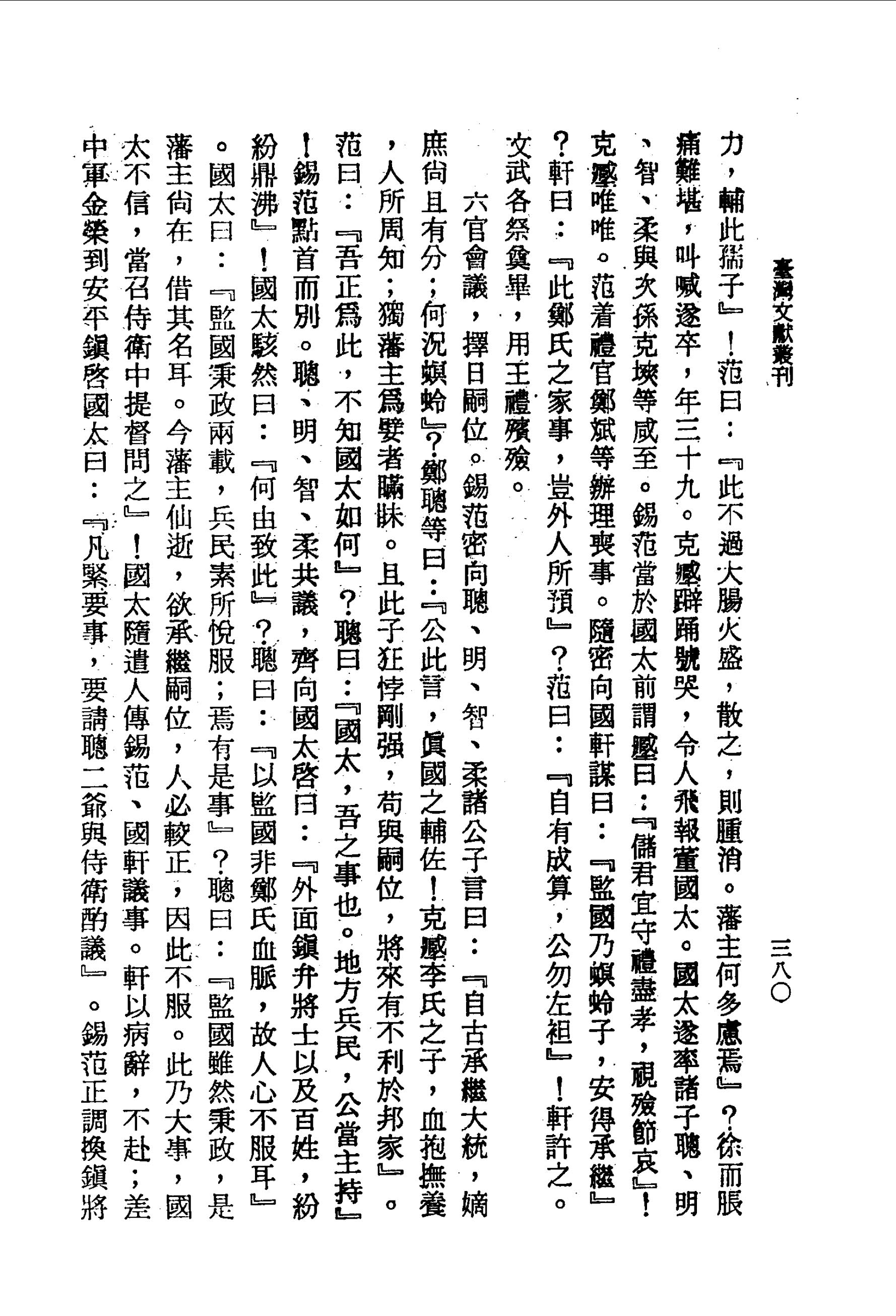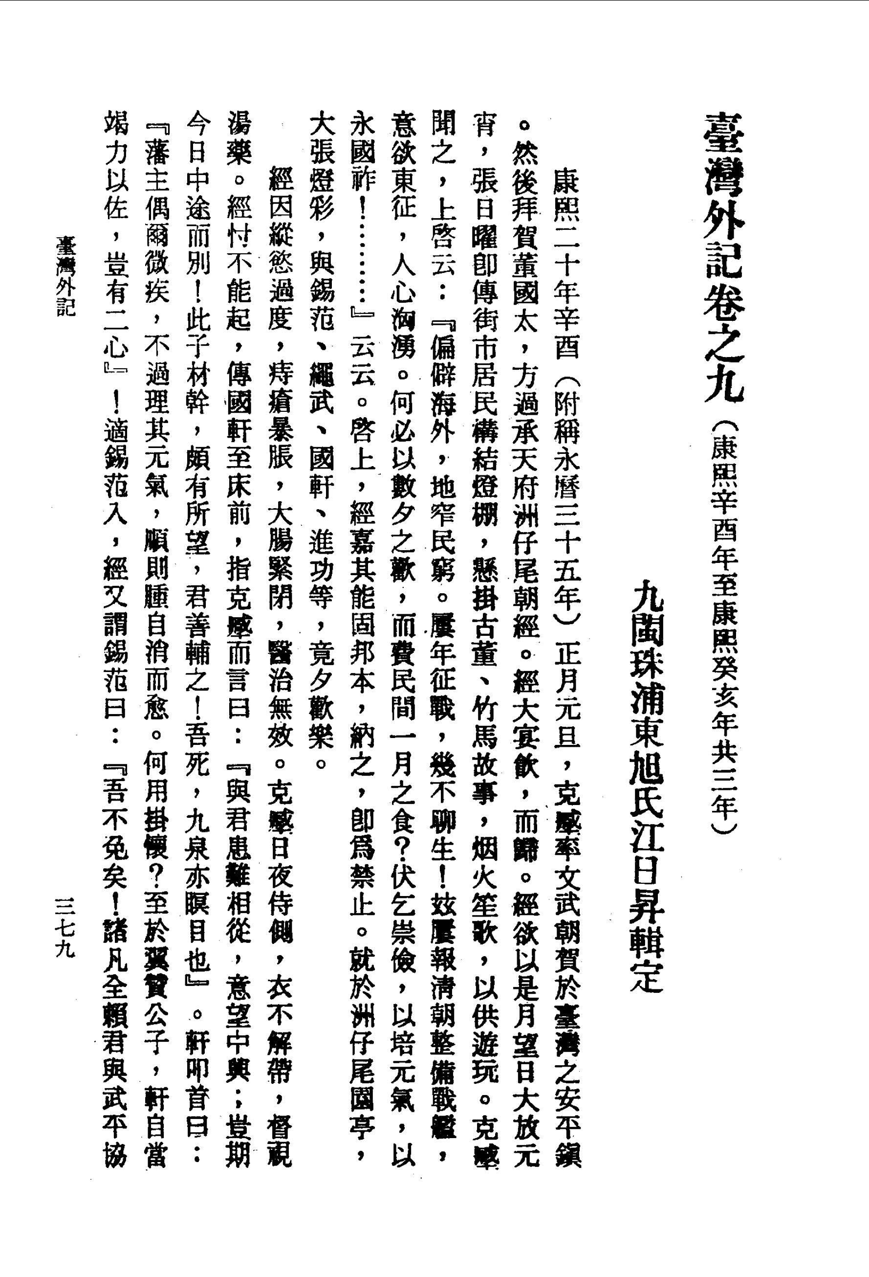經因縱慾過度,痔瘡暴脹,大腸緊閉,醫治無效。克𡒉 日夜侍側,衣不解帶,督視湯藥。經忖不能起,傳國軒至床前,指克𡒉 而言曰:『與君患難相從,意望中興;豈期今日中途而別!此子材幹,頗有所望,君善輔之!吾死,九泉亦瞑目也』。軒叩首曰:『藩主偶爾微疾,不過理其元氣,順則腫自消而愈。何用掛懷?至於翼贊公子,軒自當竭力以佐,豈有二心』!適錫范入,經又謂錫范曰:『吾不免矣!諸凡全賴君與武平協力,輔此孺子』!范曰:『此不過大腸火盛,散之,則腫消。藩主何多慮焉』?徐而脹痛難堪,叫喊遂卒,年三十九。