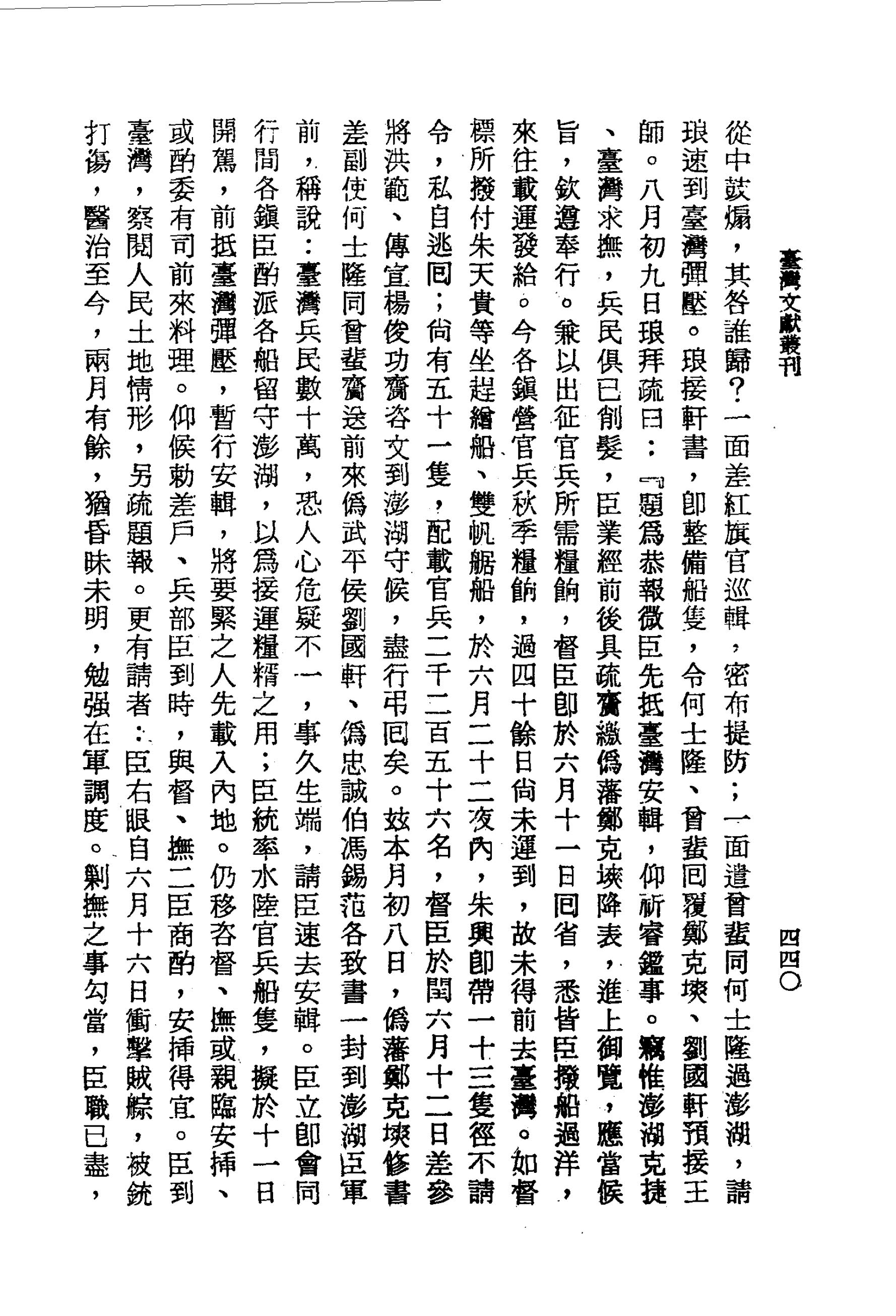 臣到臺灣,察閱人民土地情形,另疏題報。更有請者:臣右眼自六月十六日衝擊賊舟宗,被銃打傷,醫治至今,兩月有餘,猶昏昧未明,勉強在軍調度。