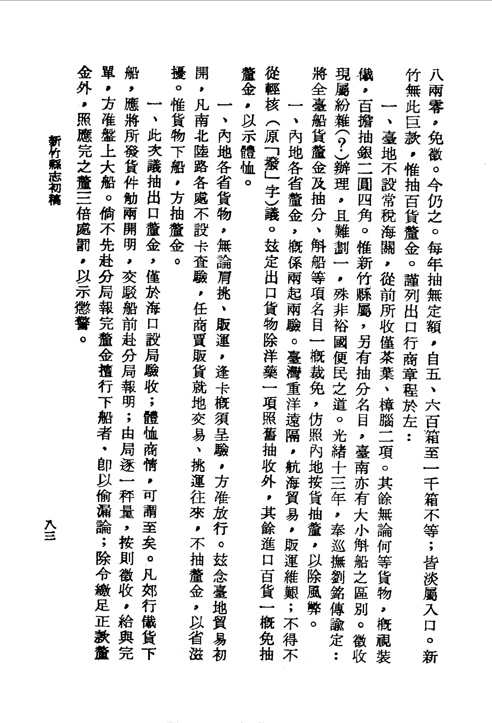 一、臺地不設常稅海關,從前所收僅茶葉、樟腦二項。其餘無論何等貨物,概視裝儎,百擔抽銀二圓四角。惟新竹縣屬,另有抽分名目,臺南亦有大小斛船之區別。徵收現屬紛雜(?)辦理,且難劃一,殊非裕國便民之道。光緒十三年,奉巡撫劉銘傳諭定:將全臺船貨釐金及抽分、斛船等項名目一概裁免,仿照內地按貨抽釐,以除風弊。