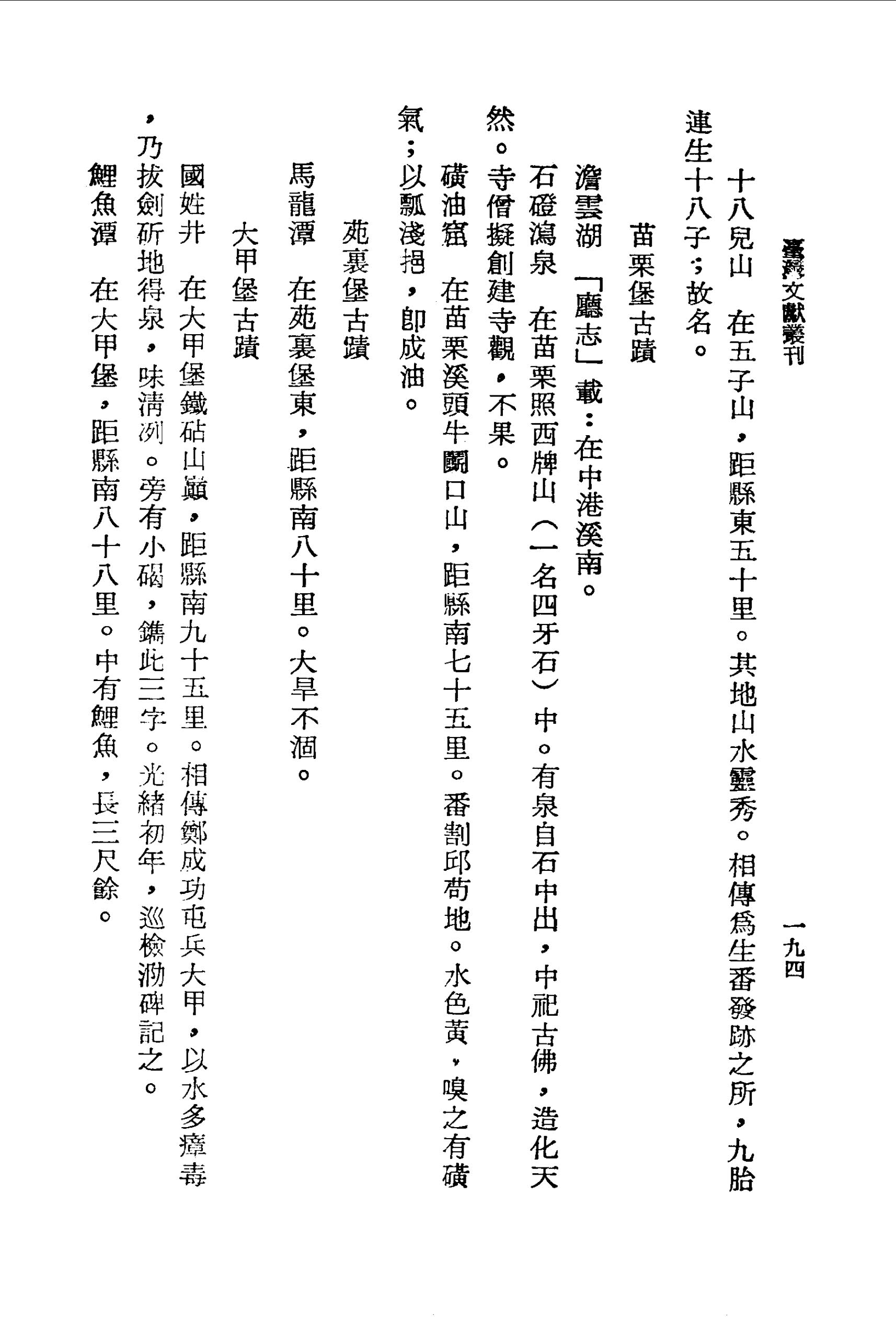 國姓井 在大甲堡鐵砧山巔,距縣南九十五里。相傳鄭成功屯兵大甲,以水多瘴毒,乃拔劍斫地得泉,味清冽。旁有小碣,鐫此三字。光緒初年,巡檢泐碑記之。