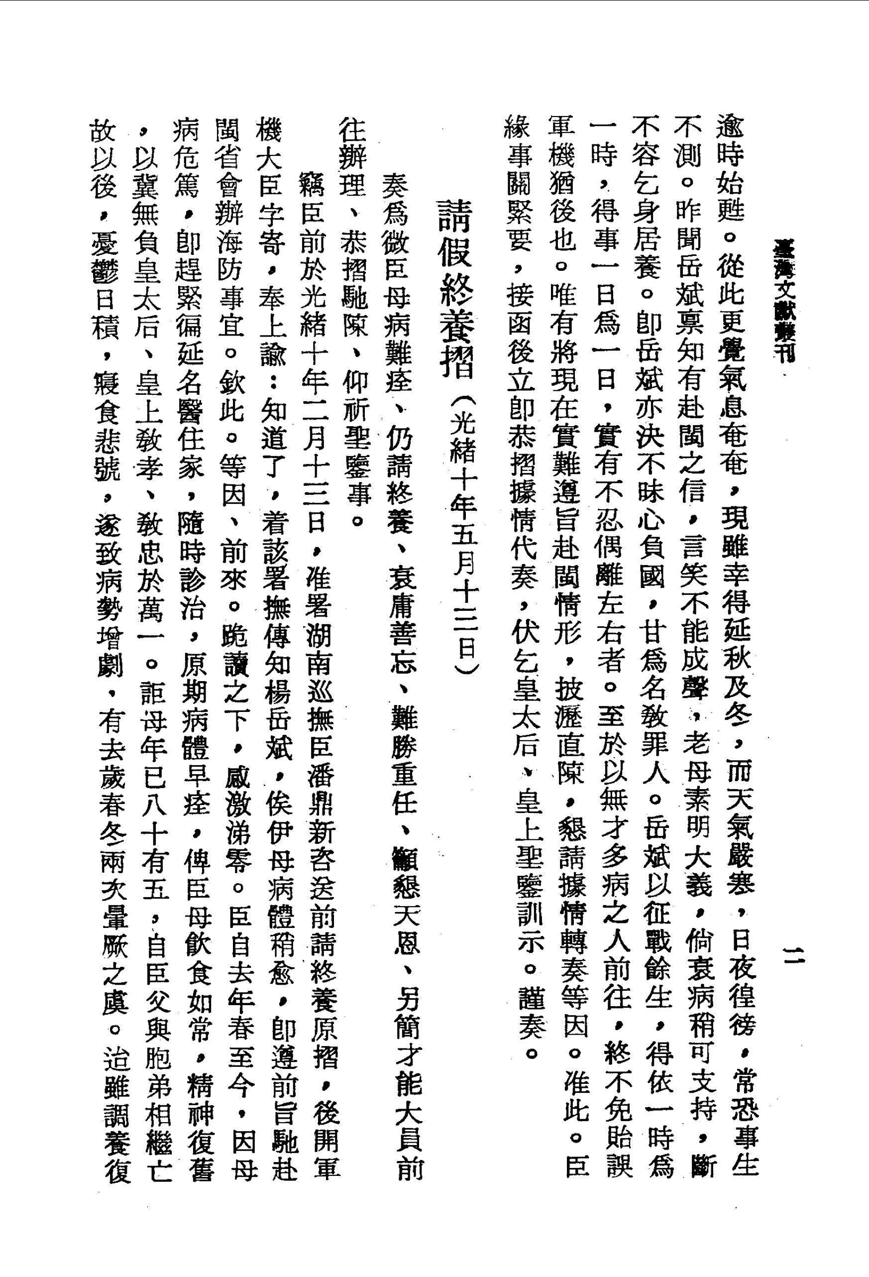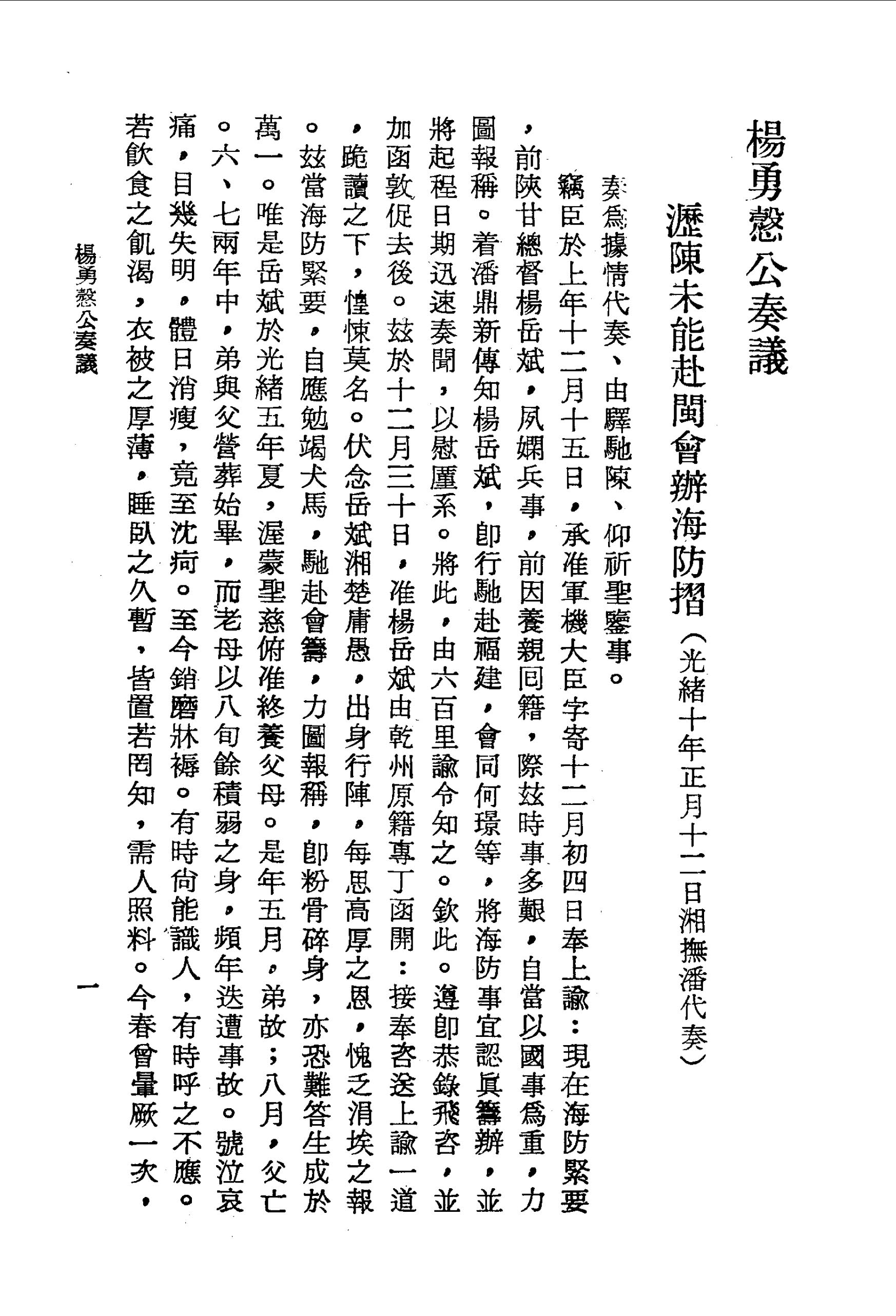唯是岳斌於光緒五年夏,渥蒙聖慈俯准終養父母。是年五月,弟故;八月,父亡。六、七兩年中,弟與父營葬始畢,而老母以八旬餘積弱之身,頻年迭遭事故。號泣哀痛,目幾失明,體日消瘦,竟至沈疴。至今銷磨床褥。有時尚能識人,有時呼之不應。若飲食之飢渴,衣被之厚薄,睡臥之久暫,皆置若罔知,需人照料。今春曾暈厥一次,逾時始甦。從此更覺氣息奄奄,現雖幸得延秋及冬,而天氣嚴寒,日夜徨徬,常恐事生不測。昨聞岳斌稟知有赴閩之信,言笑不能成聲,老母素明大義,倘衰病稍可支持,斷不容乞身居養。即岳斌亦決不昧心負國,甘為名教罪人。岳斌以征戰餘生,得依一時為一時,得事一日為一日,實有不忍偶離左右者。至於以無才多病之人前往,終不免貽誤軍機猶後也。