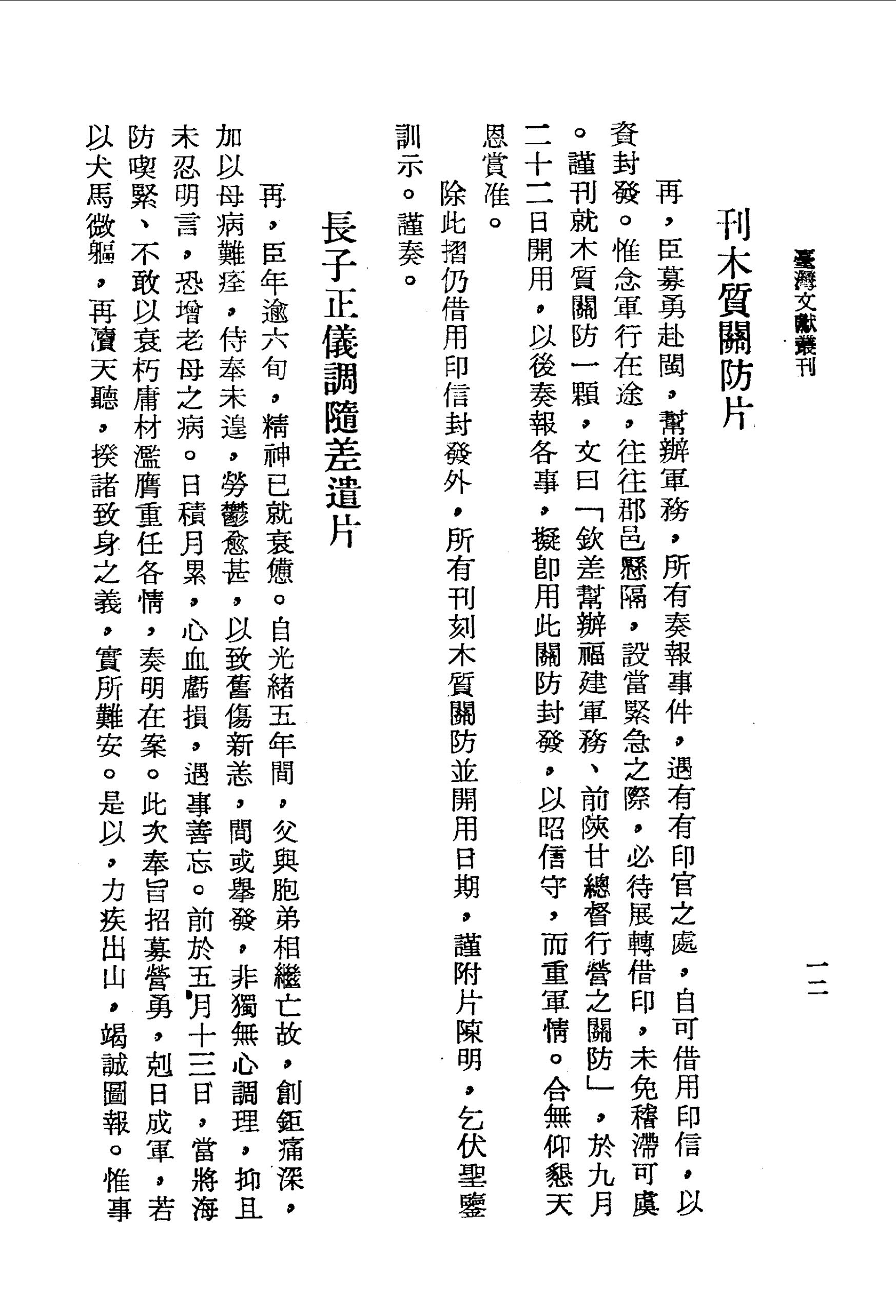 再,臣年逾六旬,精神已就衰憊。自光緒五年間,父與胞弟相繼亡故,創鉅痛深,加以母病難痊,侍奉未遑,勞鬱愈甚,以致舊傷新恙,間或舉發,非獨無心調理,抑且未忍明言,恐增老母之病。日積月累,心血虧損,遇事善忘。前於五月十三日,當將海防喫緊、不敢以衰朽庸材濫膺重任各情,奏明在案。此次奉旨招募營勇,剋日成軍,若以犬馬微軀,再瀆天聽,揆諸致身之義,實所難安。