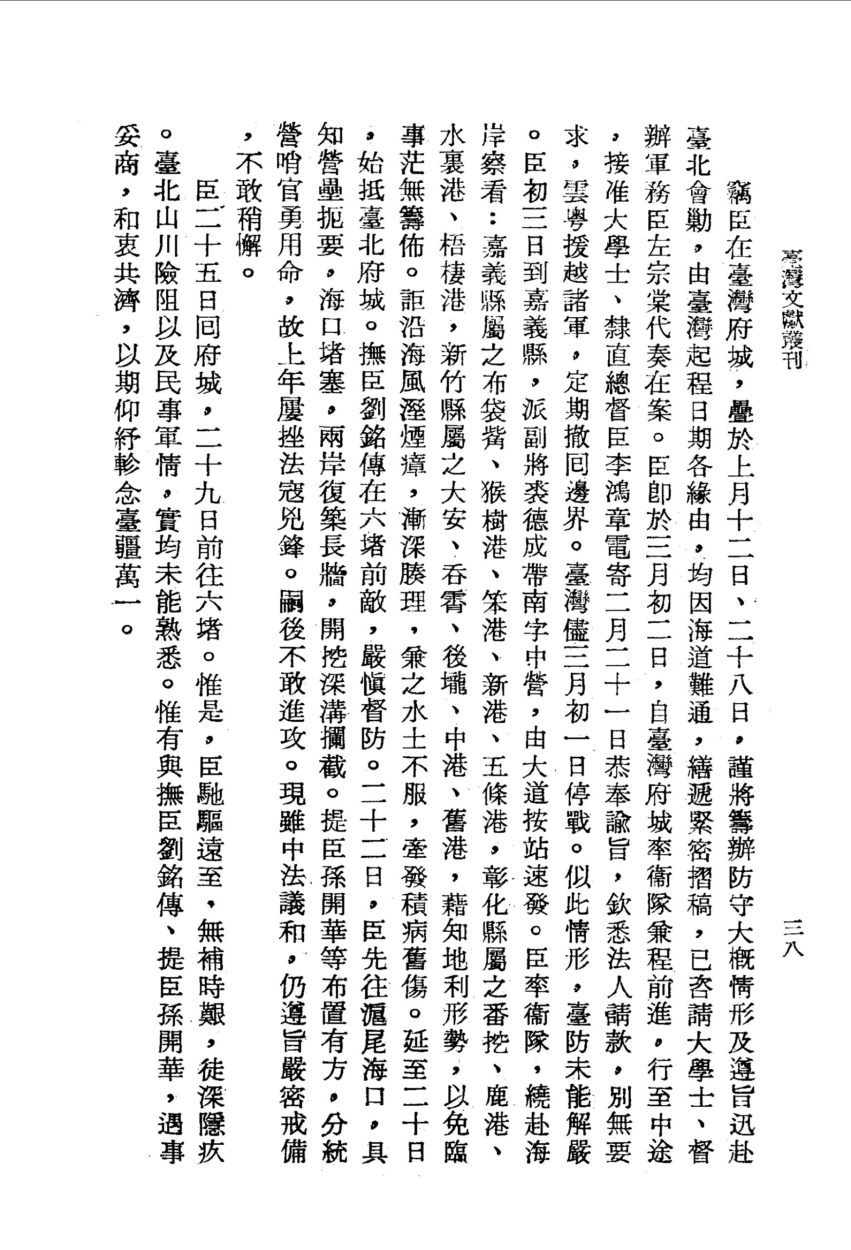 臣初三日到嘉義縣,派副將裘德成帶南字中營,由大道按站速發。臣率衛隊,繞赴海岸察看:嘉義縣屬之布袋觜、猴樹港、笨港、新港、五條港,彰化縣屬之番挖、鹿港、水裏港、梧棲港,新竹縣屬之大安、吞霄、後壠、中港、舊港,藉知地利形勢,以免臨事茫無籌佈。詎沿海風溼煙瘴,漸深腠理,兼之水土不服,牽發積病舊傷。延至二十日,始抵臺北府城。
