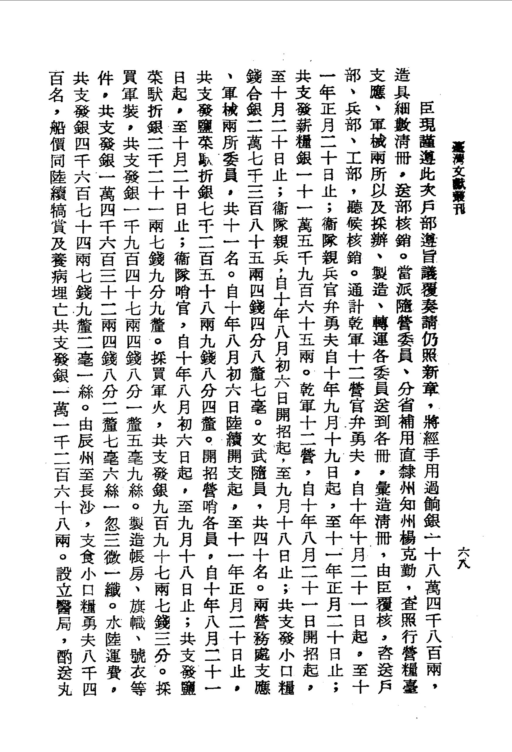 由辰州至長沙,支食小口糧勇夫八千四百名,船價同陸續犒賞及養病埋亡共支發銀一萬一千二百六十八兩。設立醫局,酌送丸藥,共支發銀二百八十一兩七錢四分。