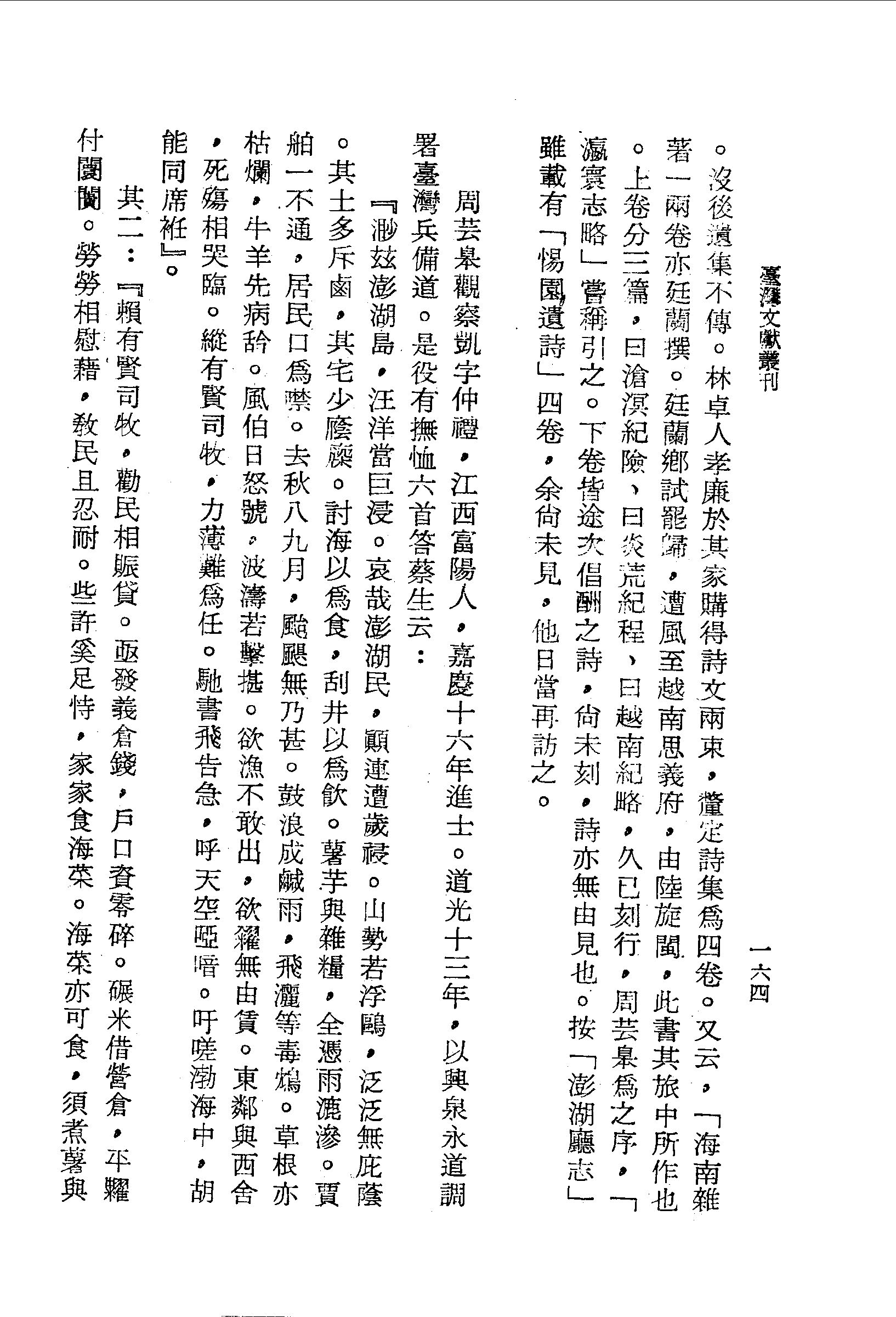 賴有賢司牧,勸民相賑貸。亟發義倉錢,戶口資零碎。碾米借營倉,平糶付闤闠。勞勞相慰藉,教民且忍耐。些許奚足恃,家家食海菜。海菜亦可食,須煮薯與米。苟無薯與米,食之病且癠。肢體日浮腫,耳目日昏眯。漸與鬼為鄰,捄死恐莫遞。況自秋徂春,瓶罌罄如洗。賣兒無人收,賣女空泣涕。朝朝望海天,伏地首九稽。海舟其速來,皇恩尚可徯