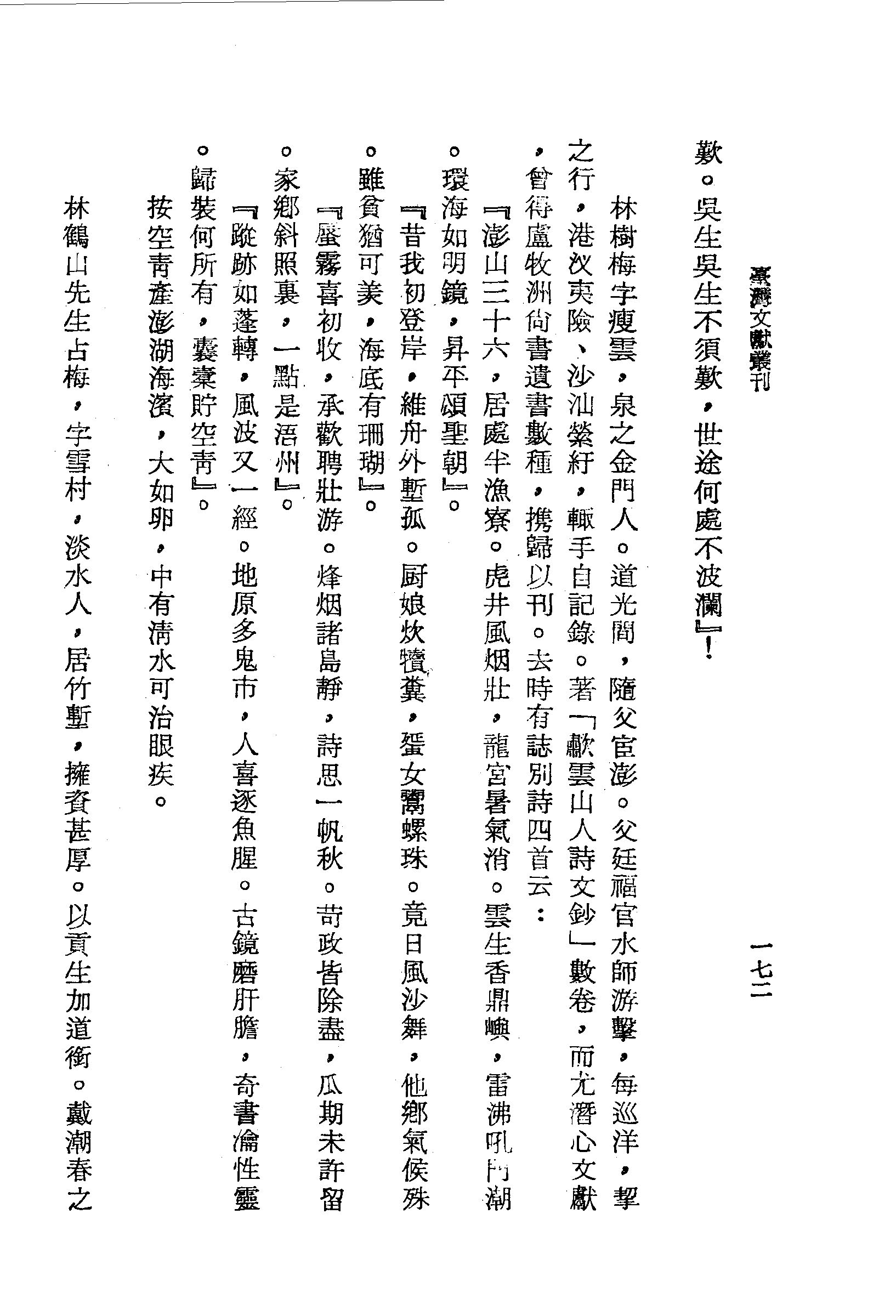 『蹤跡如蓬轉,風波又一經。地原多鬼市,人喜逐魚腥。古鏡磨肝膽,奇書瀹性靈。歸裝何所有,囊橐貯空青』。 按空青產澎湖海濱,大如卵,中有清水可治眼疾。