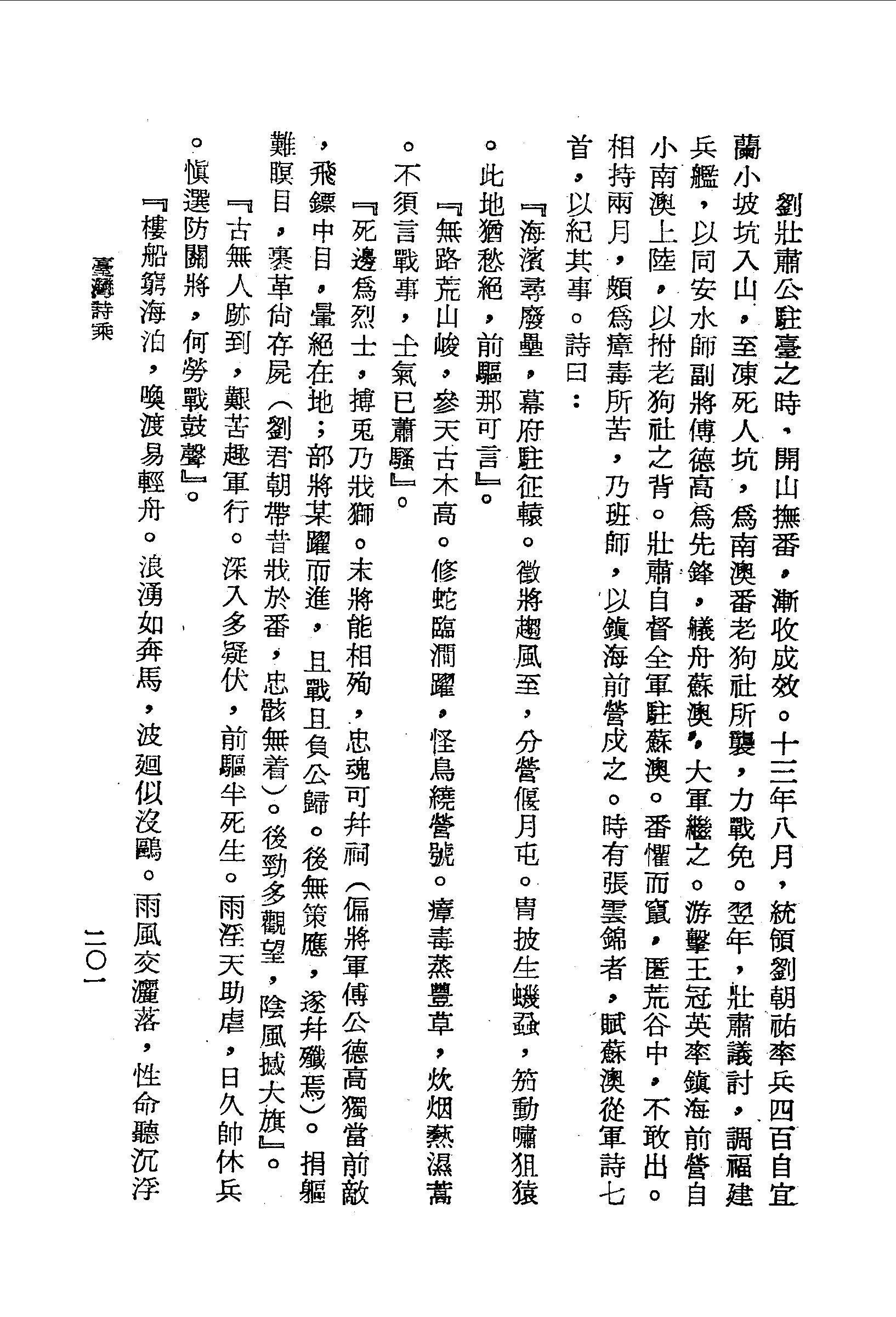 劉壯肅公駐臺之時,開山撫番,漸收成效。十三年八月,統領劉朝祐率兵四百自宜蘭小坡坑入山,至凍死人坑,為南澳番老狗社所襲,力戰免。翌年,壯肅議討,調福建兵艦,以同安水師副將傅德高為先鋒,艤舟蘇澳,大軍繼之。游擊王冠英率鎮海前營自小南澳上陸,以拊老狗社之背。壯肅自督全軍駐蘇澳。番懼而竄,匿荒谷中,不敢出。相持兩月,頗為瘴毒所苦,乃班師,以鎮海前營戍之。