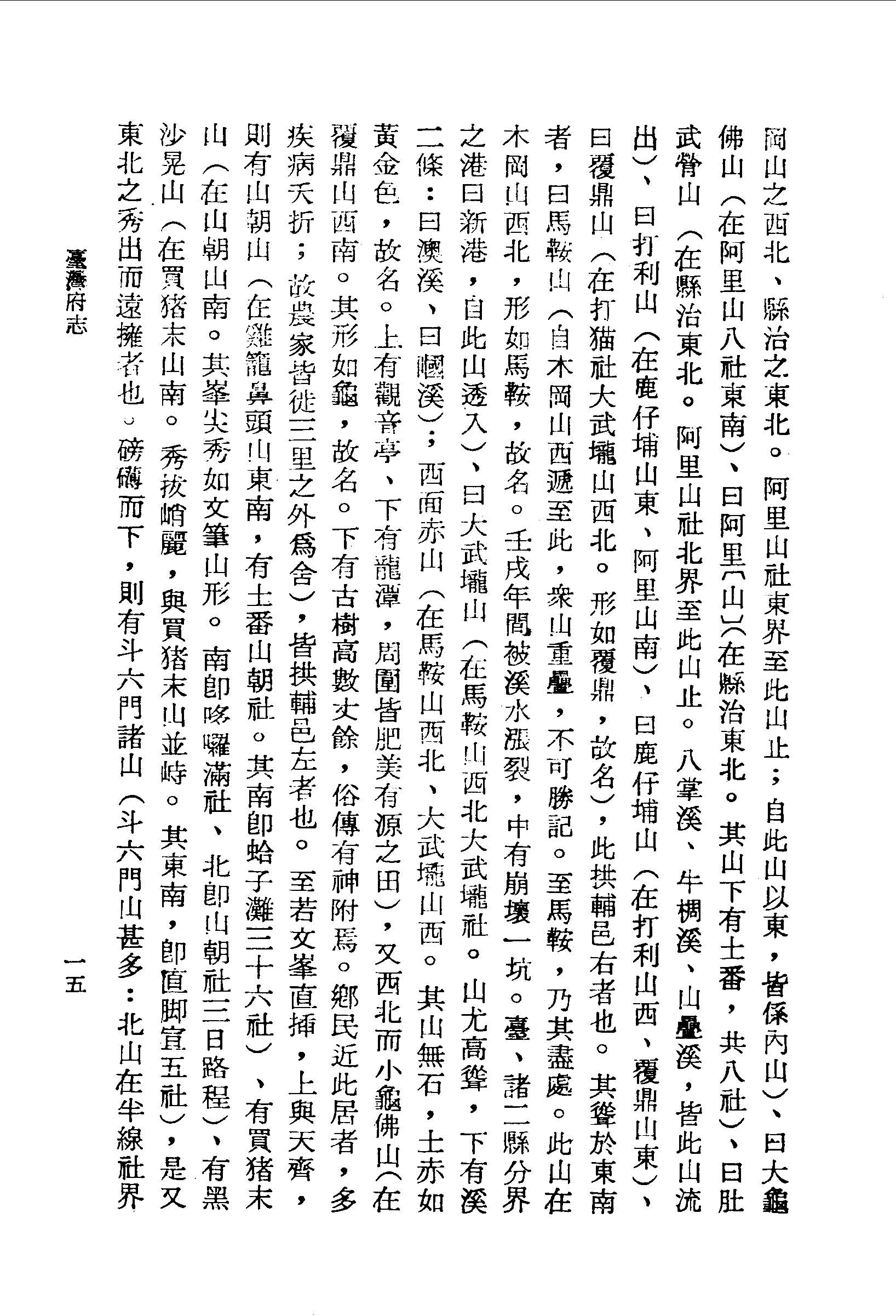 其聳於東南者,曰馬鞍山(自木岡山西遞至此,眾山重疊,不可勝記。至馬鞍,乃其盡處。此山在木岡山西北,形如馬鞍,故名。壬戌年間被溪水漲裂,中有崩壞一坑。 臺、諸二縣分界之港曰新港,自此山透入)、曰大武壠山(在馬鞍山西北大武壠社。山尤高聳,下有溪二條:曰澳溪、曰嘓溪);西面赤山(在馬鞍山西北、大武壠山西。其山無石,土赤如黃金色,故名。 上有觀音亭、下有龍潭,周圍皆肥美有源之田),又西北而小龜佛山(在覆鼎山西南。其形如龜,故名。下有古樹高數丈餘,俗傳有神附焉。鄉民近此居者,多疾病夭折;故農家皆徙三里之外為舍),皆拱輔邑左者也。
