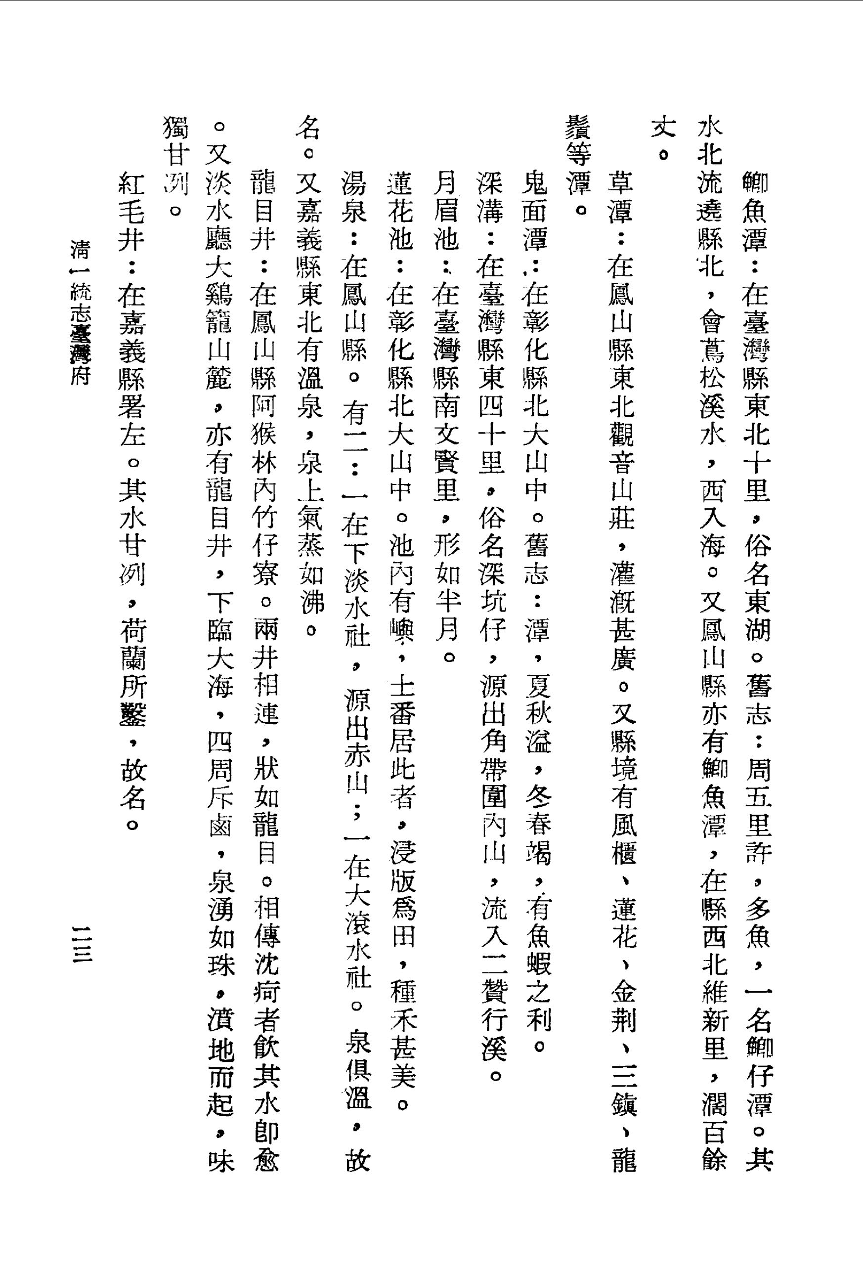 龍目井:在鳳山縣阿猴林內竹仔寮.兩井相連,狀如龍目.相傳沈疴者飲其水即愈。又淡水廳大雞籠山麓,亦有龍目井,下臨大海,四周斥鹵,泉湧如珠,濆地而起,味獨甘冽。