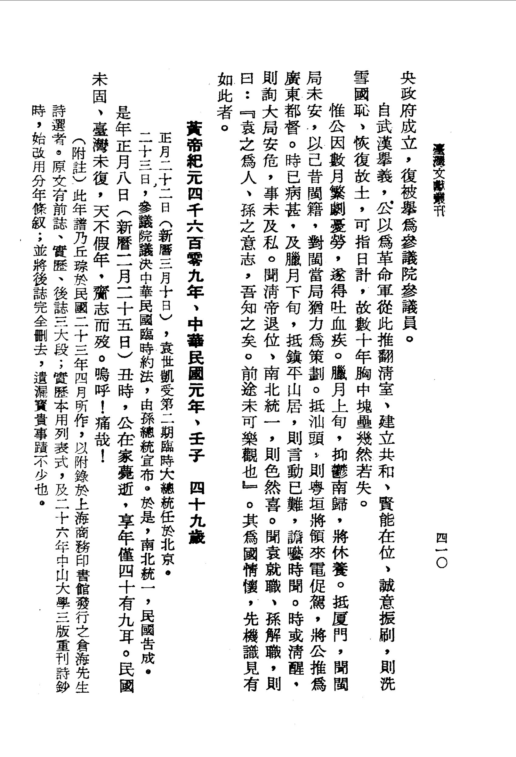 惟公因數月繁劇憂勞,遂得吐血疾。臘月上旬,抑鬱南歸,將休養。抵廈門,聞閩局未安,以己昔閩籍,對閩當局猶力為策劃。抵汕頭,則粵垣將領來電促駕,將公推為廣東都督。時已病甚,及臘月下旬,抵鎮平山居,則言動已難,譫囈時聞。時或清醒,則詢大局安危,事未及私。聞清帝退位、南北統一,則色然喜。聞袁就職、孫解職,則曰:『袁之為人、孫之意志,吾知之矣。前途未可樂觀也』。其為國情懷,先機識見有如此者。