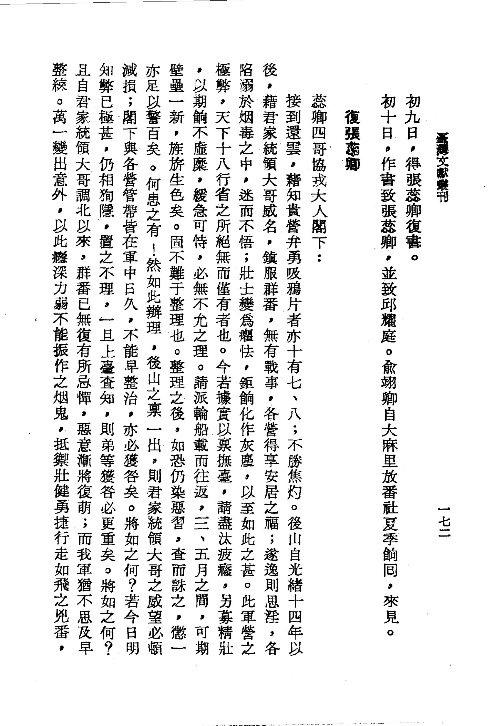 接到還雲,藉知貴營弁勇吸鴉片者亦十有七、八;不勝焦灼。後山自光緒十四年以後,藉君家統領大哥威名,鎮服群番,無有戰事,各營得享安居之福;遂逸則思淫,各陷溺於烟毒之中,迷而不悟;壯士變為癯怯,鉅餉化作灰塵,以至如此之甚。此軍營之極弊,天下十八行省之所絕無而僅有者也。今若據實以稟撫臺,請盡汰疲癃,另募精壯,以期餉不虛糜,緩急可恃,必無不允之理。