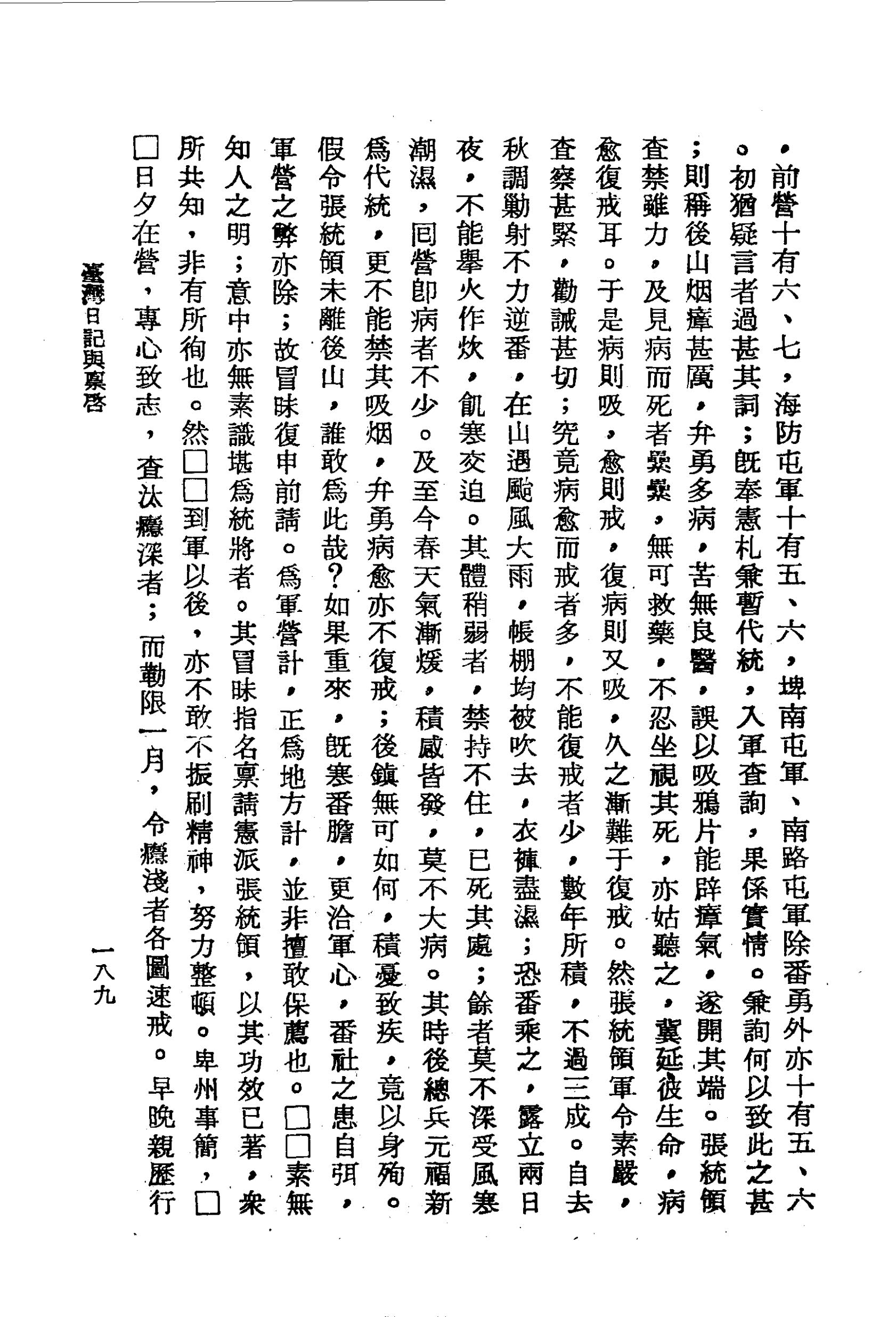 初猶疑言者過甚其詞;既奉憲札兼暫代統,入軍查詢,果係實情。兼詢何以致此之甚;則稱後山烟瘴甚厲,弁勇多病,苦無良醫,誤以吸鴉片能辟瘴氣,遂開其端。張統領查禁雖力,及見病而死者纍纍,無可救藥,不忍坐視其死,亦姑聽之,冀延彼生命,病愈復戒耳。于是病則吸,愈則戒,復病則又吸,久之漸難于復戒。然張統領軍令素嚴,查察甚緊,勸誡甚切;究竟病癒而戒者多,不能復戒者少,數年所積,不過三成。