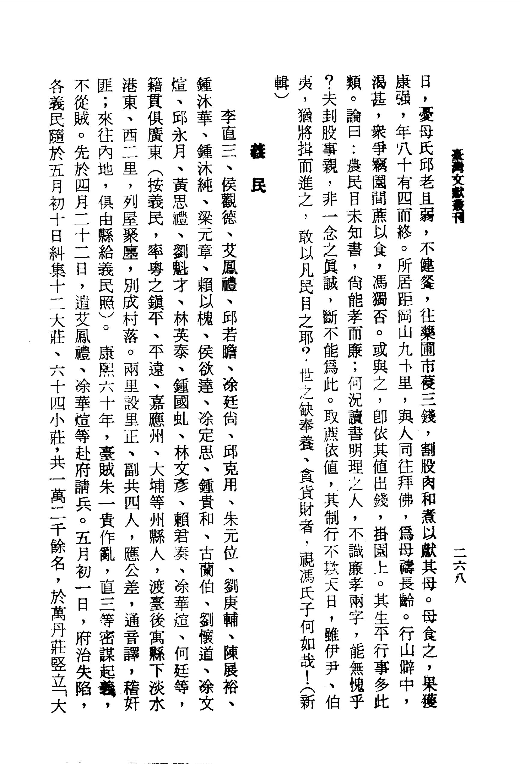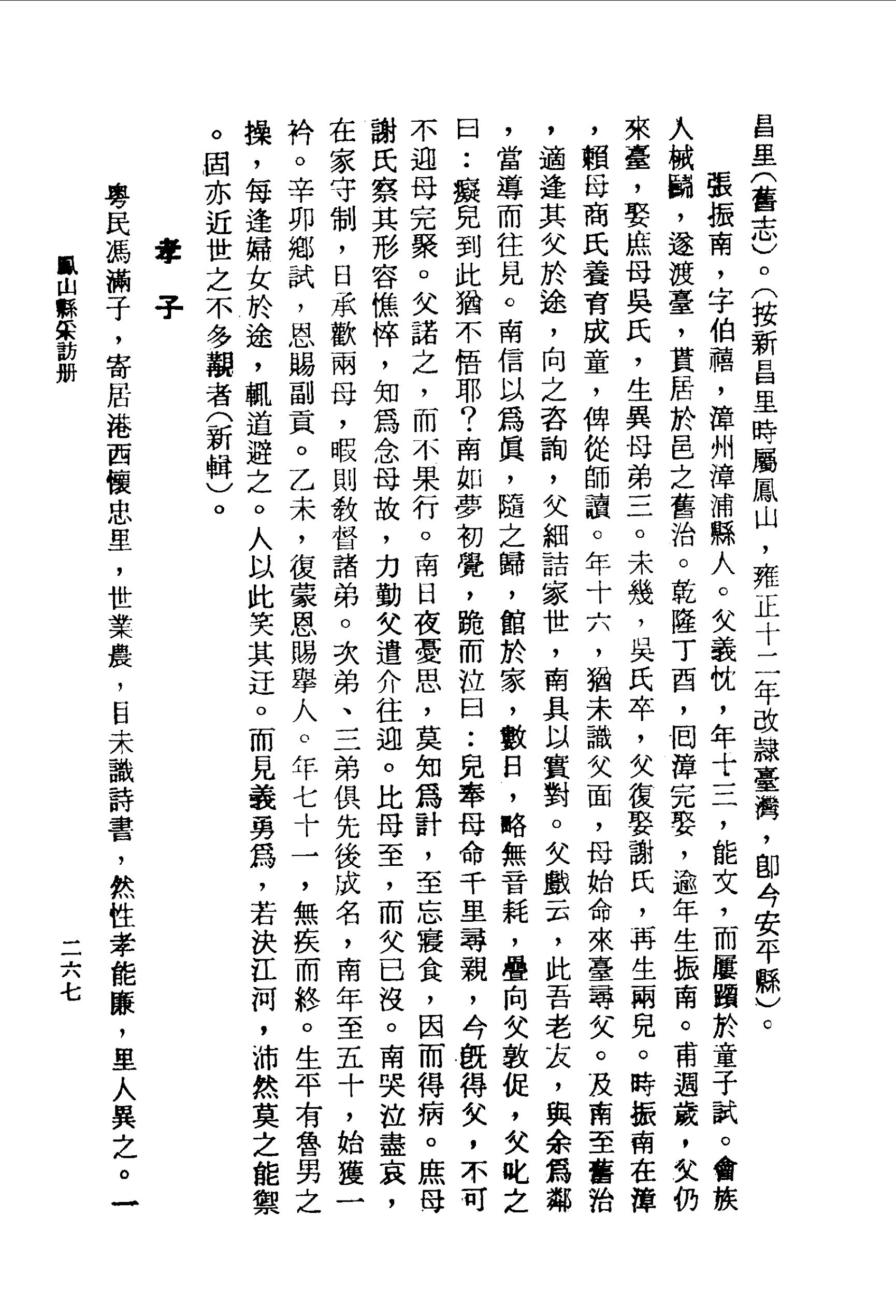 粵民馮滿子,寄居港西懷忠里,世業農,目未識詩書,然性孝能廉,里人異之。 一日,憂母氏邱老且弱,不健餐,往藥圃市葠三錢,割股肉和煮以獻其母。母食之,果獲康強,年八十有四而終。所居距岡山九十里,與人同往拜佛,為母禱長齡。行山僻中,渴甚,眾爭竊園間蔗以食,馮獨否。或與之,即依其值出錢,掛園上。其生平行事多此類。論曰:農民目未知書,尚能孝而廉;何況讀書明理之人,不識廉孝兩字,能無愧乎?夫刲股事親,非一念之真誠,斷不能為此。取蔗依值,其制行不欺天日,雖伊尹、伯夷,猶將揖而進之,敢以凡民目之耶?世之缺奉養、貪貨財者,視馮氏子何如哉!(新輯)