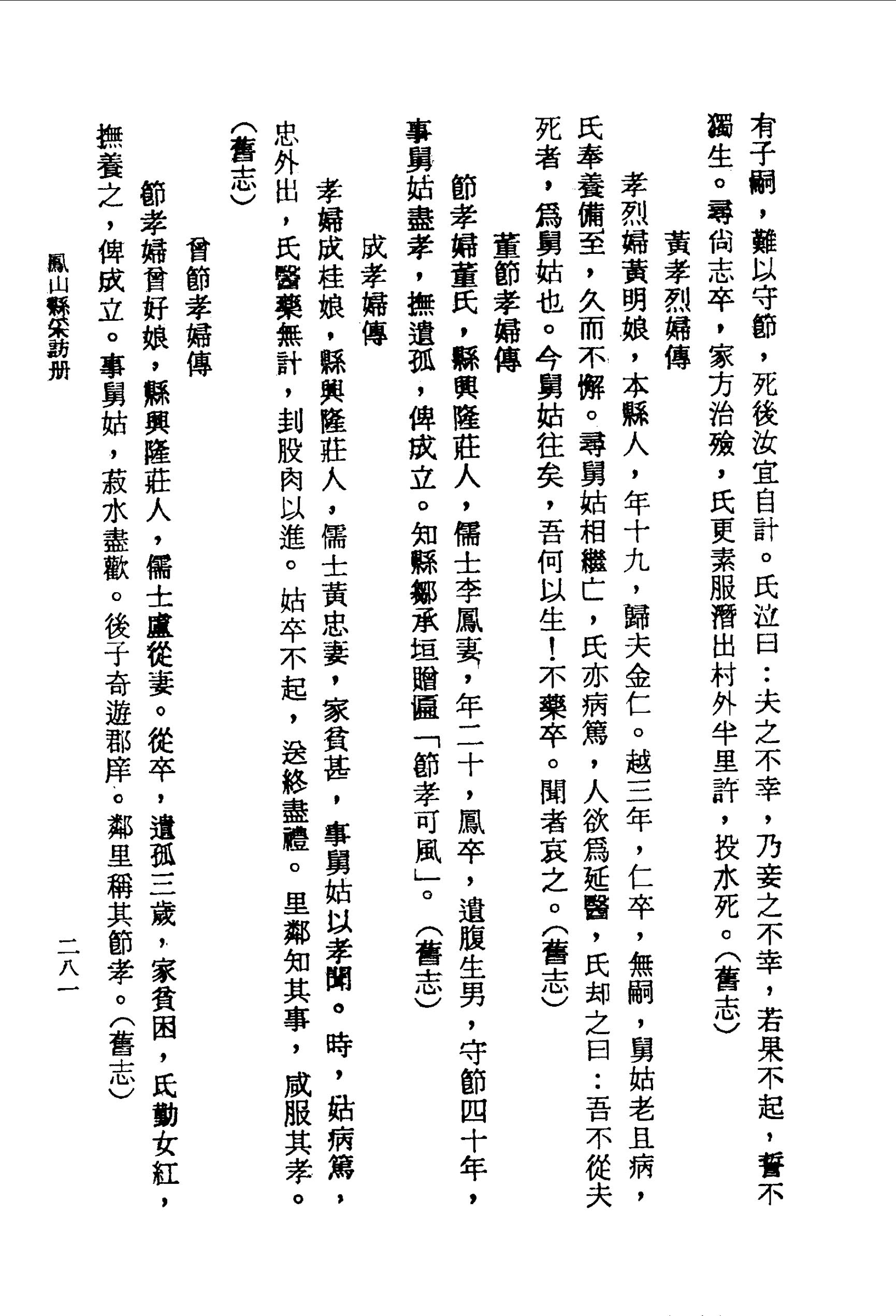 孝婦成桂娘,縣興隆莊人,儒士黃忠妻,家貧甚,事舅姑以孝聞。時,姑病篤,忠外出,氏醫藥無計,刲股肉以進。姑卒不起,送終盡禮。里鄰知其事,咸服其孝。(舊志)