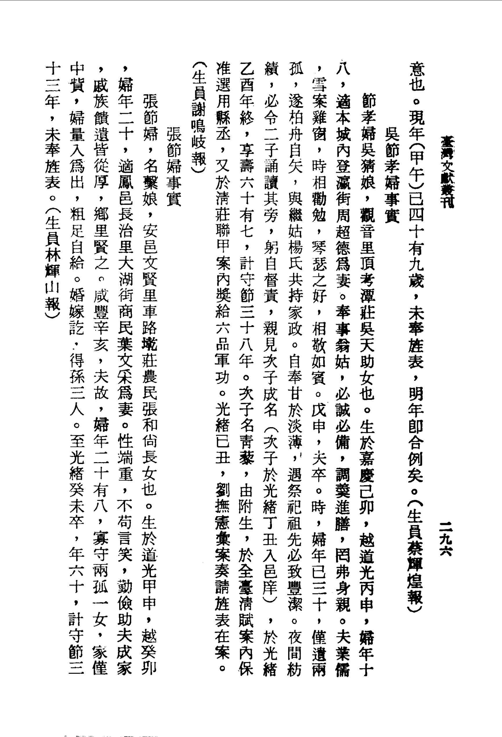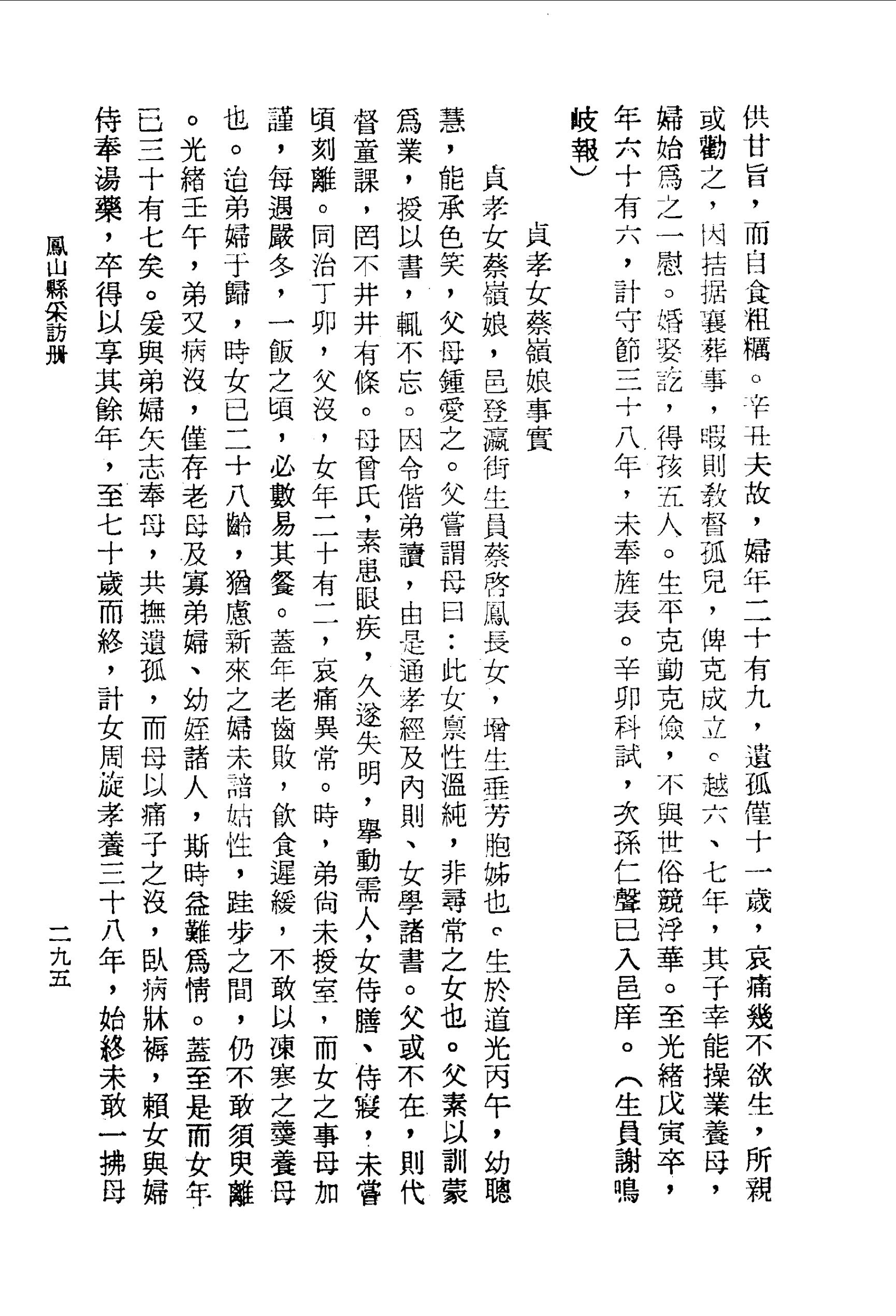 貞孝女蔡嶺娘,邑登瀛街生員蔡啟鳳長女,增生垂芳胞姊也。生於道光丙午,幼聰慧,能承色笑,父母鍾愛之。父嘗謂母曰:此女稟性溫純,非尋常之女也。父素以訓蒙為業,授以書,輒不忘。因令偕弟讀,由是通孝經及內則、女學諸書。父或不在,則代督童課,罔不井井有條。母曾氏,素患眼疾,久遂失明,舉動需人,女侍膳、侍寢,未嘗頃刻離。同治丁卯,父沒,女年二十有二,哀痛異常。時,弟尚未授室,而女之事母加謹,每遇嚴冬,一飯之頃,必數易其餐。蓋年老齒敗,飲食遲緩,不敢以凍寒之羹養母也。迨弟婦于歸,時女已二十八齡,猶慮新來之婦未諳姑性,跬步之間,仍不敢須臾離。光緒壬午,弟又病沒,僅存老母及寡弟婦、幼姪諸人,斯時益難為情。蓋至是而女年已三十有七矣。爰與弟婦矢志奉母,共撫遺孤,而母以痛子之沒,臥病床褥,賴女與婦侍奉湯藥,卒得以享其餘年,至七十歲而終,計女周旋孝養三十八年,始終未敢一拂母意也。現年(甲午)已四十有九歲,未奉旌表,明年即合例矣。(生員蔡輝煌報)