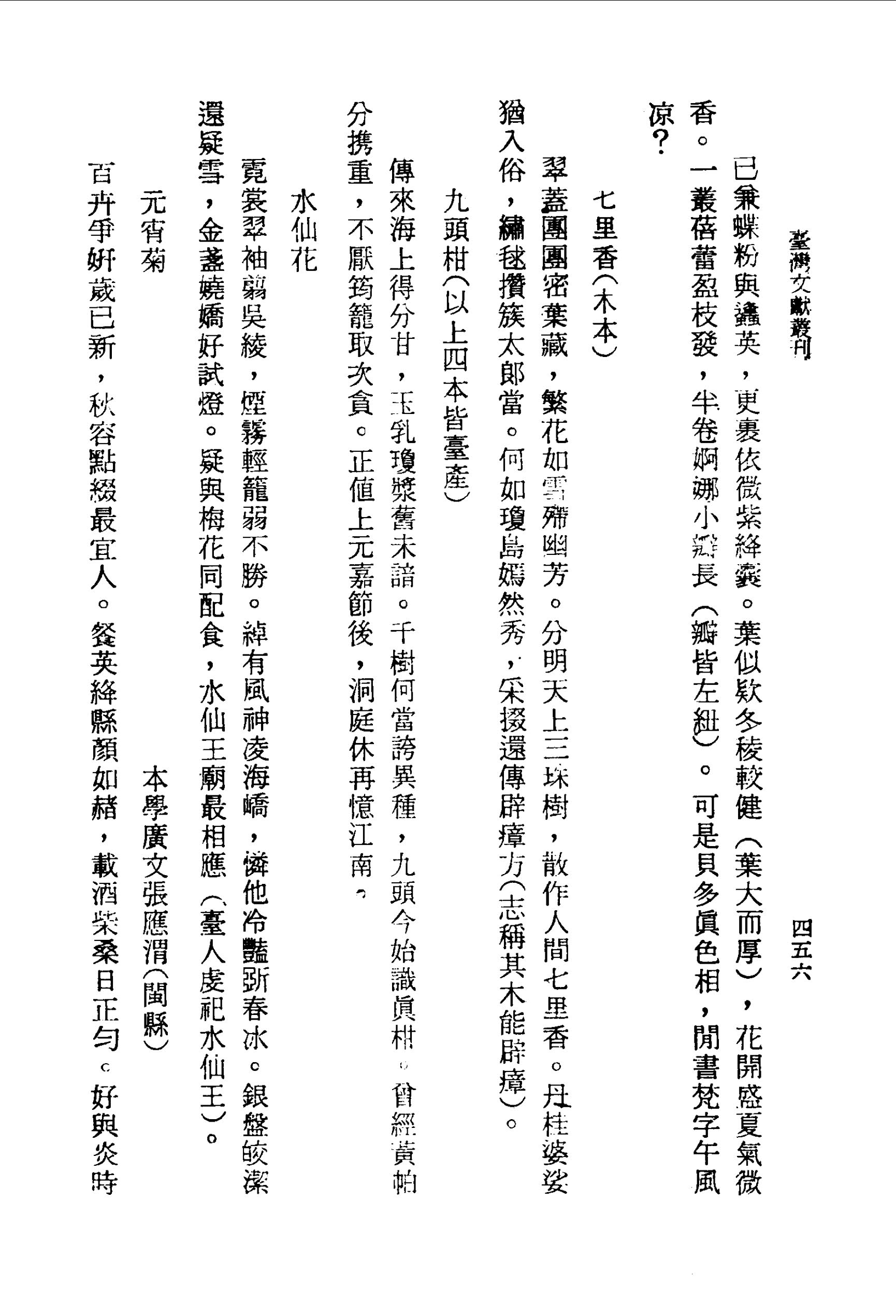 翠蓋團團密葉藏,繁花如雪殢幽芳。分明天上三珠樹,散作人間七里香。丹桂婆娑猶入俗,繡毬攢簇太郎當。何如瓊島嫣然秀,采掇還傳辟瘴方(志稱其木能辟瘴)。