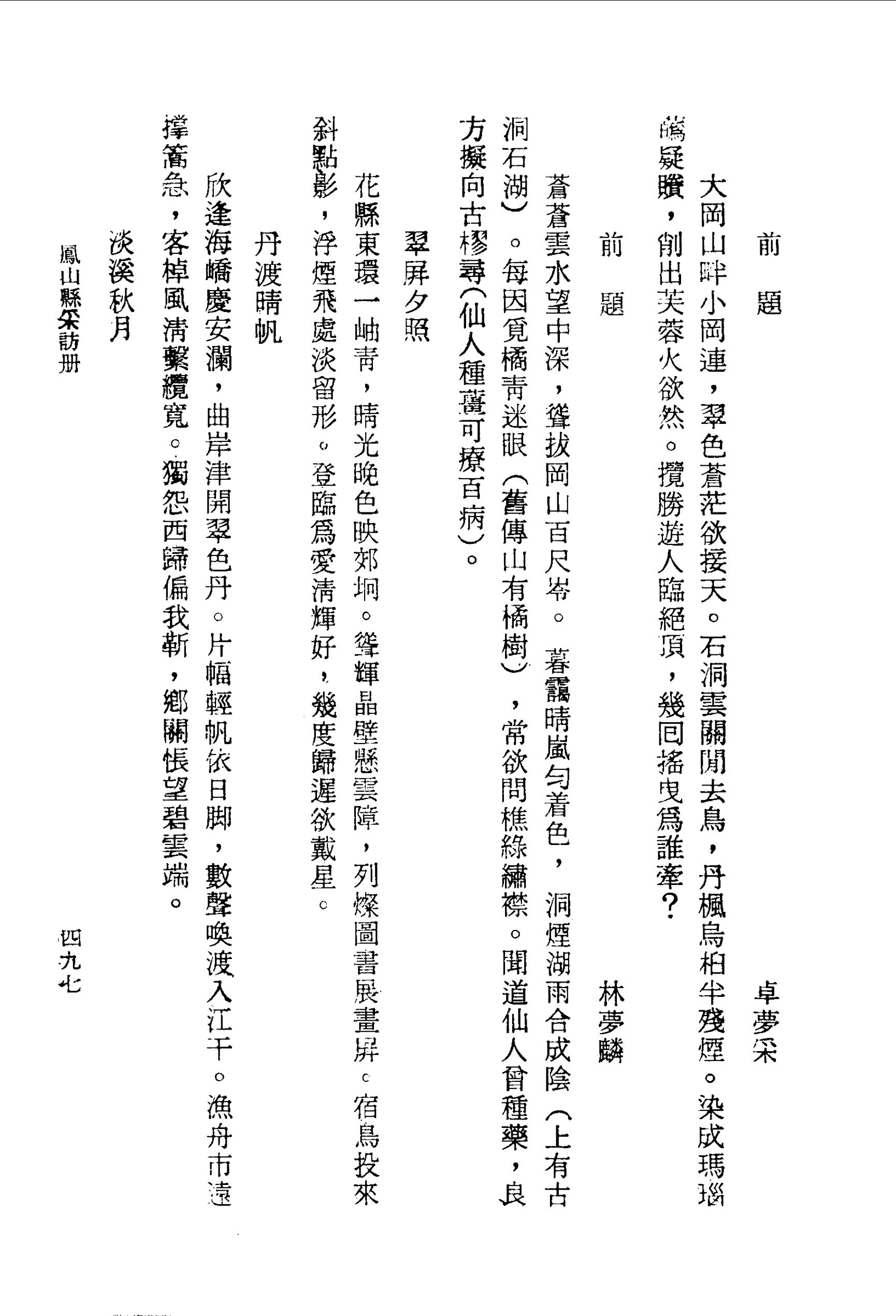 蒼蒼雲水望中深,聳拔岡山百尺岺。暮靄晴嵐勻著色,洞煙湖雨合成陰(上有古洞石湖)。每因覓橘青迷眼(舊傳山有橘樹),常欲問樵綠繡襟。聞道仙人曾種藥,良方擬向古樛尋(仙人種薑可療百病)。