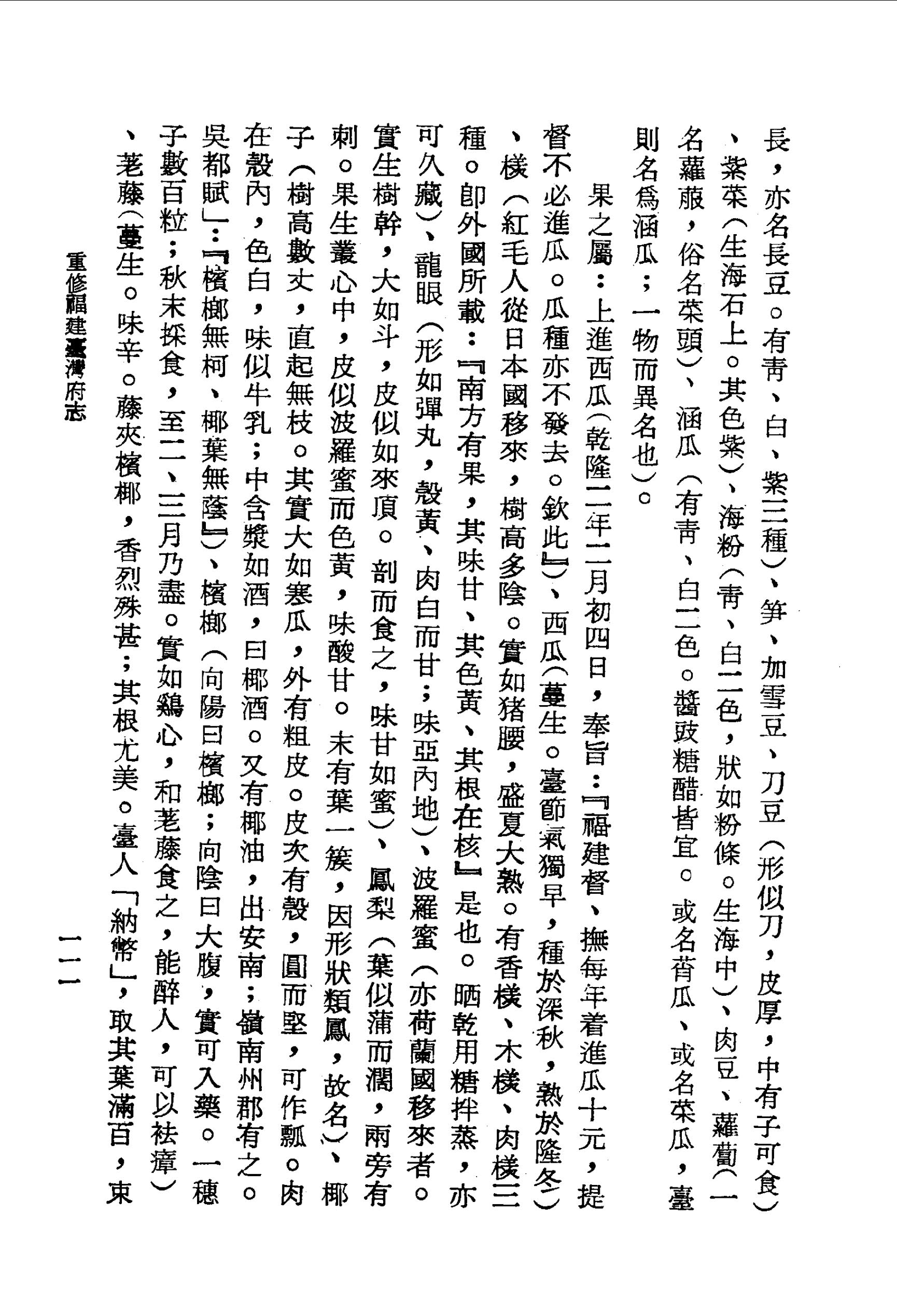 檳榔(向陽曰檳榔;向陰曰大腹,實可入藥。一穗子數百粒;秋末採食,至二、三月乃盡。實如雞心,和荖藤食之,能醉人,可以袪瘴)