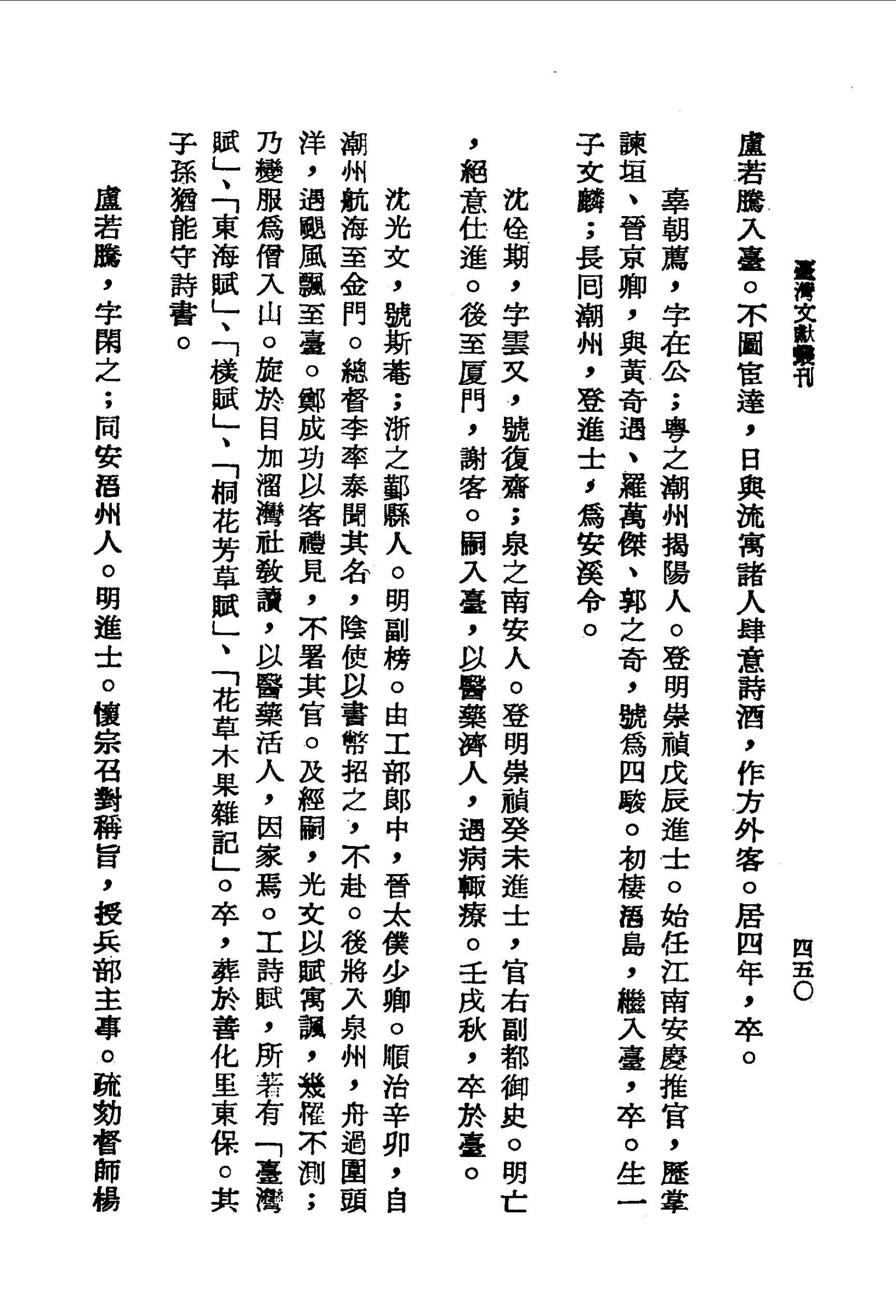 沈佺期,字雲又,號復齋;泉之南安人。登明崇禎癸未進士,官右副都御史。明亡,絕意仕進。後至廈門,謝客。嗣入臺,以醫藥濟人,遇病輒療。壬戌秋,卒於臺。