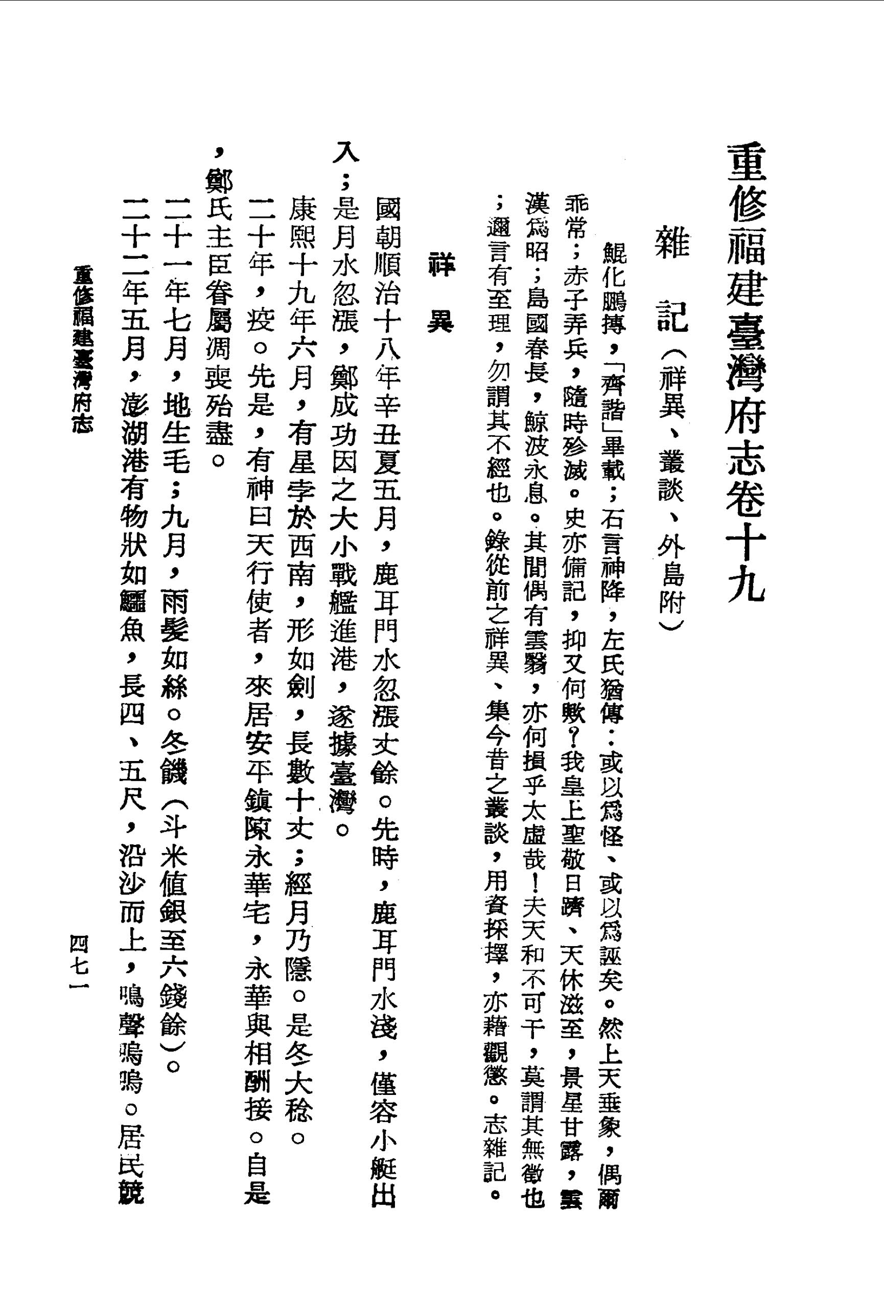 二十年,疫。先是,有神曰天行使者,來居安平鎮陳永華宅,永華與相酬接。自是,鄭氏主臣眷屬凋喪殆盡。