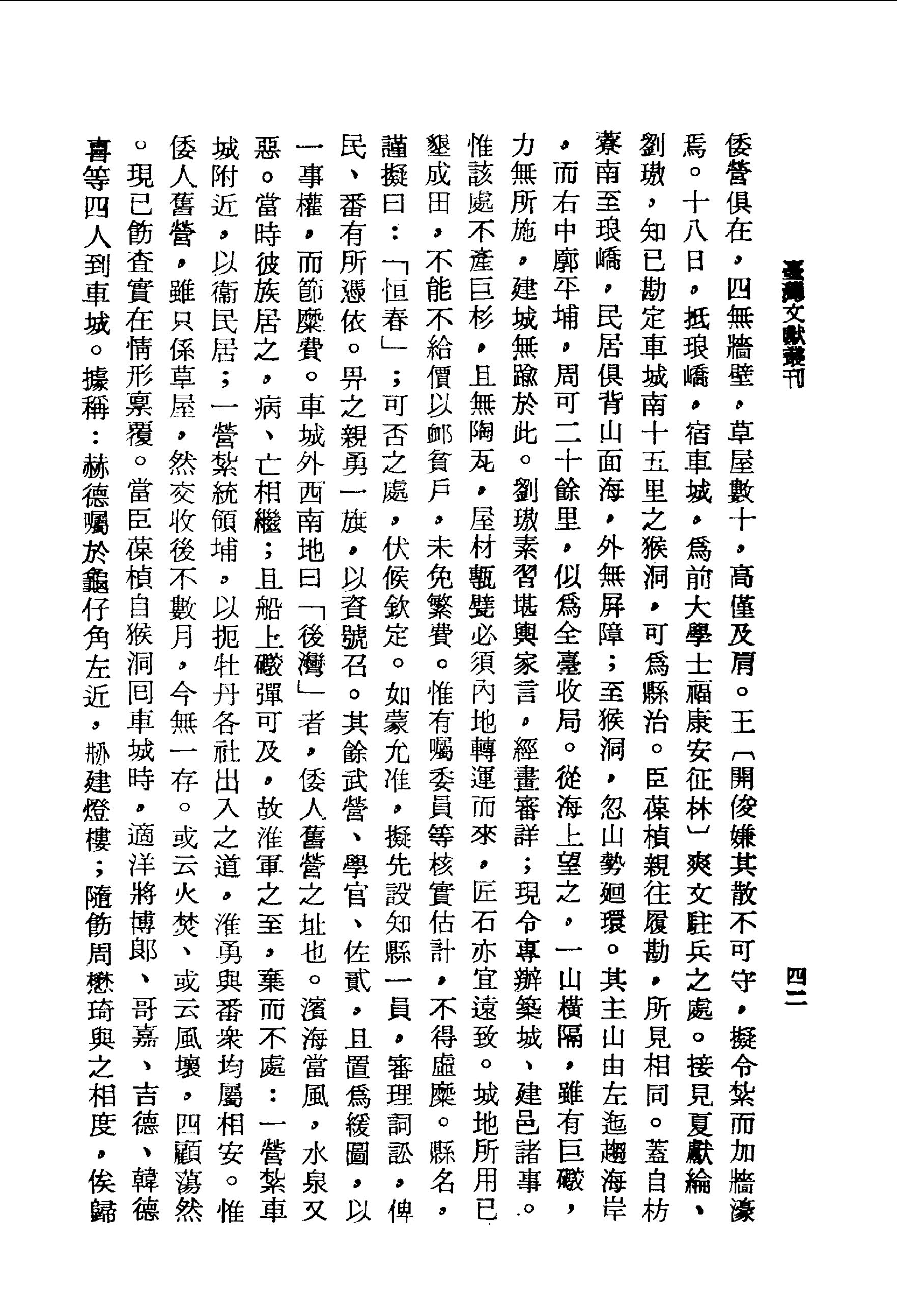 車城外西南地曰「後灣」者,倭人舊營之址也。濱海當風,水泉又惡。當時彼族居之,病、亡相繼;且船上礮彈可及,故淮軍之至,棄而不處:一營紮車城附近,以衛民居;一營紮統領埔,以扼牡丹各社出入之道,淮勇與番眾均屬相安。惟倭人舊營,雖只係草屋,然交收後不數月,今無一存。或云火焚、或云風壞,四顧蕩然。