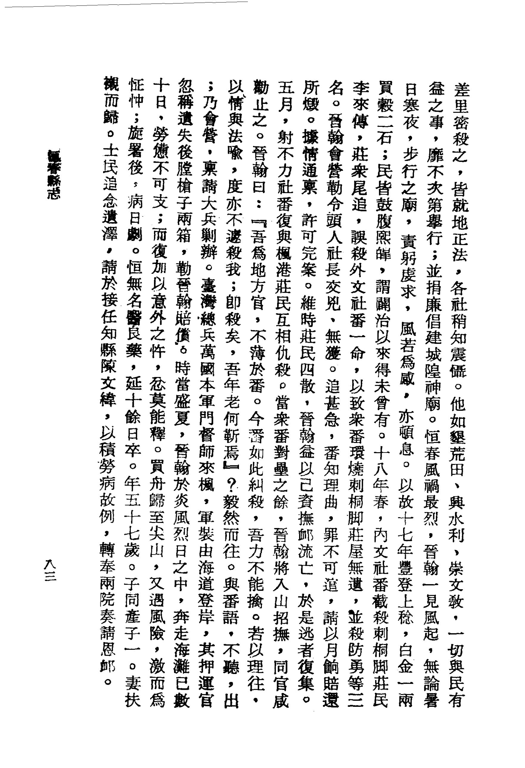 臺灣總兵萬國本軍門督師來楓,軍裝由海道登岸,其押運官忽稱遺失後膛槍子兩箱,勒晉翰賠償。時當盛夏,晉翰於炎風烈日之中,奔走海灘已數十日,勞憊不可支;而復加以意外之忤,忿莫能釋。買舟歸至尖山,又遇風險,激而為怔忡;旋署後,病日劇。恆無名醫良藥,延十餘日卒。年五十七歲。子同產子一。妻扶襯而歸。士民追念遺澤,請於接任知縣陳文緯,以積勞病故例,轉奉兩院奏請恩卹。