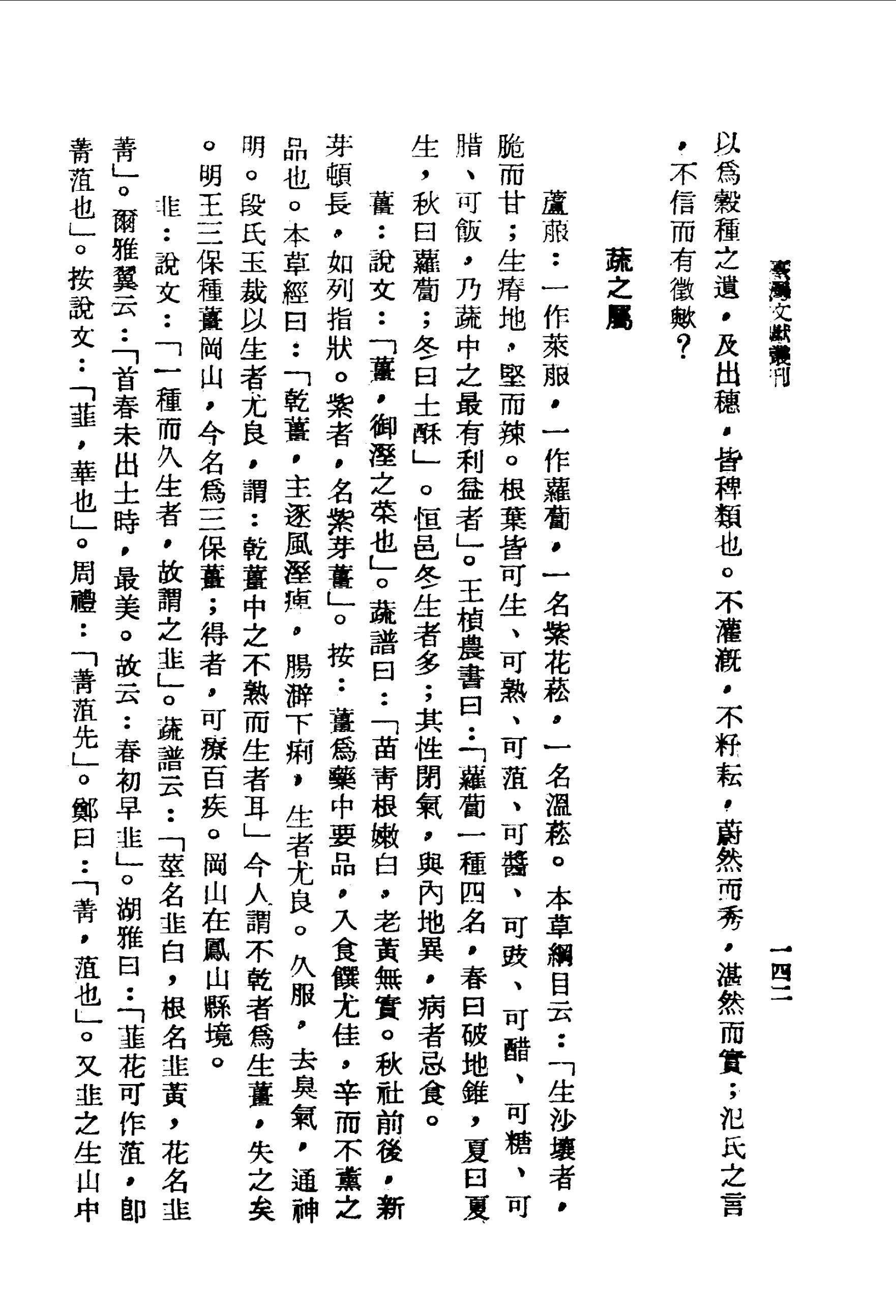 蘆菔:一作萊菔,一作蘿蔔,一名紫花菘,一名溫菘.本草綱目云:「生沙壤者,脆而甘;生瘠地,堅而辣.根葉皆可生、可熟、可菹、可醬、可豉、可醋、可糖、可腊、可飯,乃蔬中之最有利益者」.王楨農書曰:「蘿蔔一種四名,春曰破地錐,夏曰夏生,秋曰蘿蔔;冬曰土酥」.恆邑冬生者多;其性閉氣,與內地異,病者忌食.