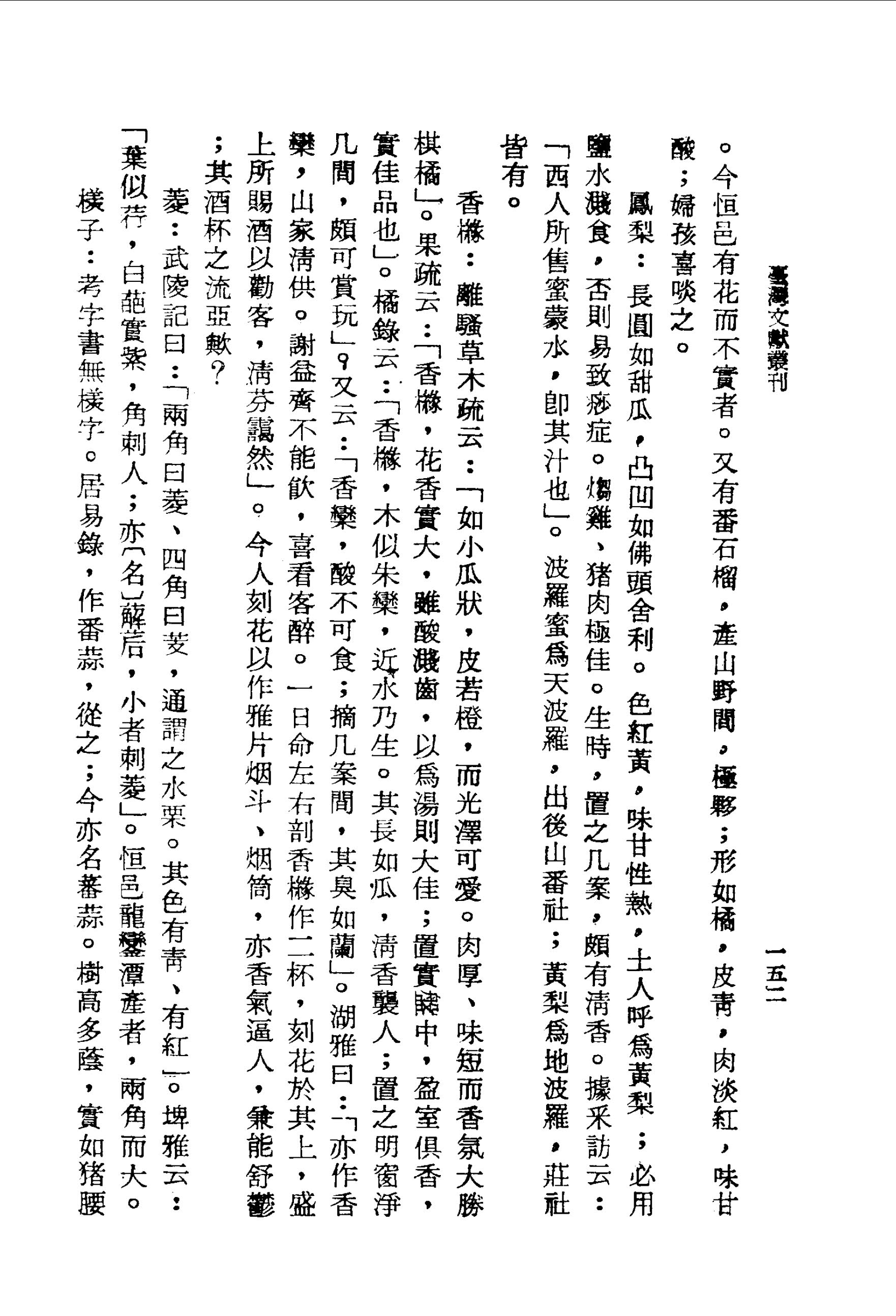 鳳梨:長圓如甜瓜,凸凹如佛頭舍利。色紅黃,味甘性熱,土人呼為黃梨;必用鹽水濺食,否則易致痧症。煼雞、豬肉極佳。生時,置之几案,頗有清香。據采訪云:「西人所售蜜蒙水,即其汁也」。波羅蜜為天波羅,出後山番社;黃梨為地波羅,莊社皆有。