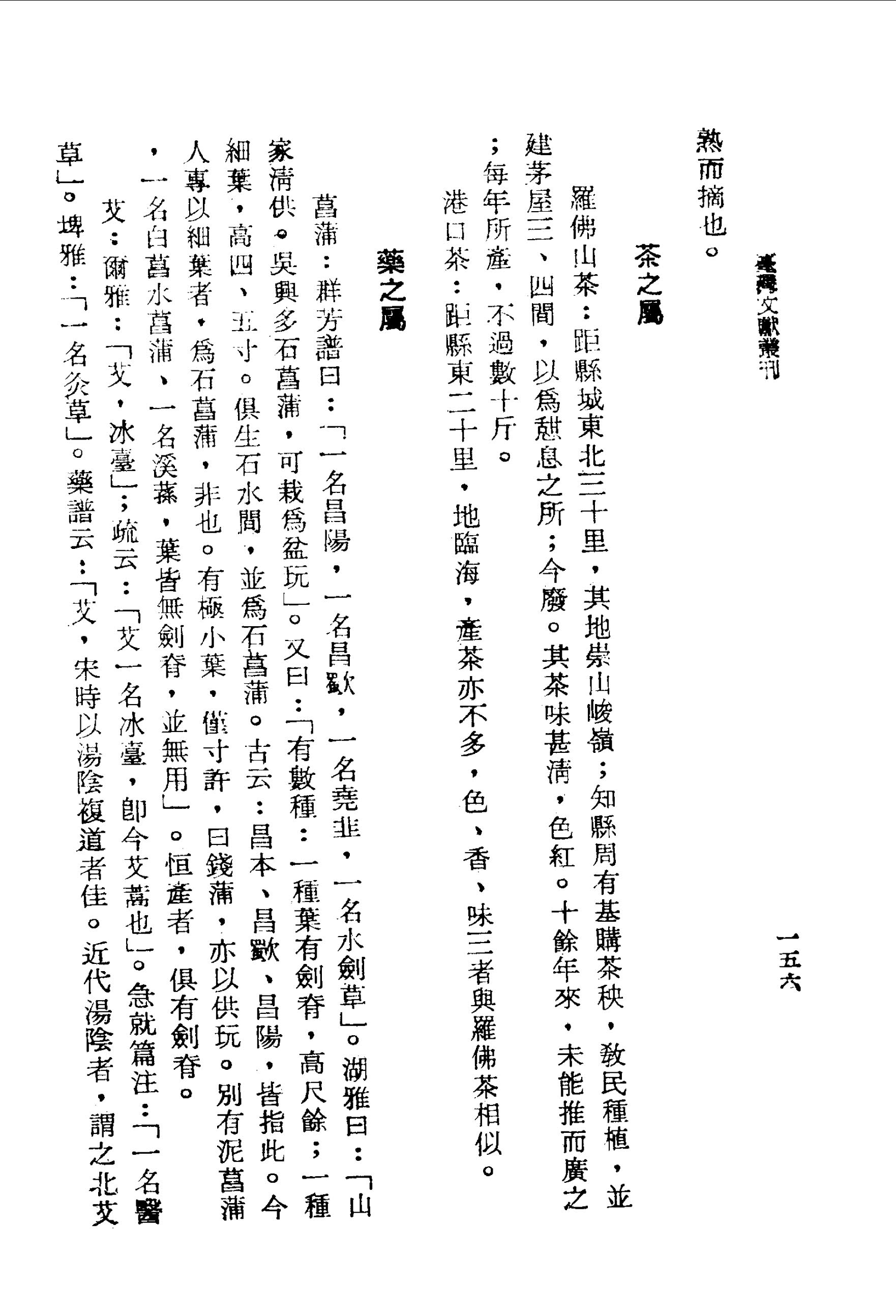 菖蒲:群芳譜曰:「一名昌陽,一名昌歜,一名堯韭,一名水劍草」。湖雅曰:「山家清供。吳興多石菖蒲,可栽為盆玩」。又曰:「有數種:一種葉有劍脊,高尺餘;一種細葉,高四、五寸。俱生石水間,並為石菖蒲。古云:昌本、昌歜、昌陽,皆指此。今人專以細葉者,為石菖蒲,非也。有極小葉,僅寸許,曰錢蒲,亦以供玩。別有泥菖蒲,一名白菖水菖蒲、一名溪蓀,葉皆無劍脊,並無用」。恆產者,俱有劍脊。