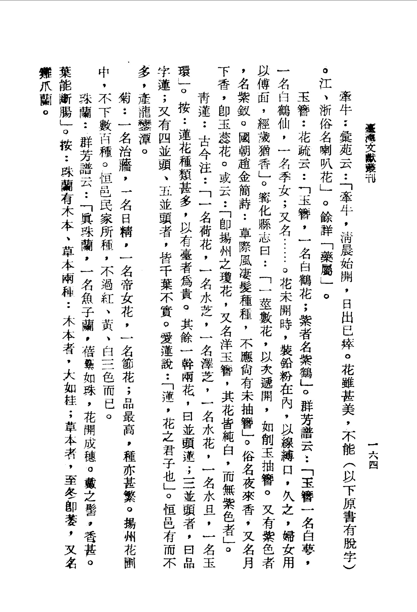 牽牛:彙苑云:「牽牛,清晨始開,日出已瘁.花雖甚美,不能(以下原書有脫字).江、浙俗名喇叭花」。