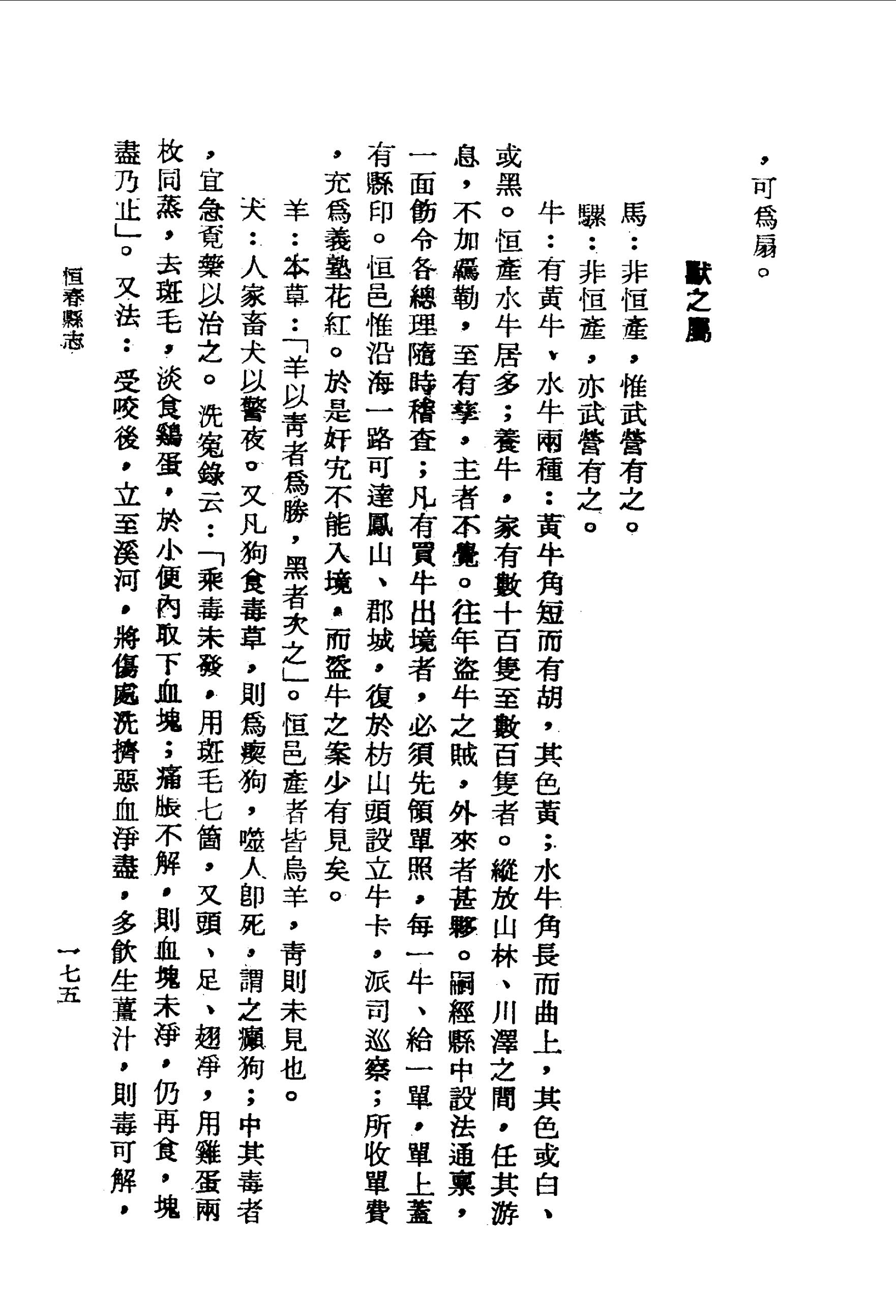 犬:人家畜犬以警夜.又凡狗食毒草,則為瘈狗,噬人即死,謂之癲狗;中其毒者,宜急覓藥以治之.洗冤錄云:「乘毒未發,用斑毛七箇,又頭、足、翅淨,用雞蛋兩枚同蒸,去斑毛,淡食雞蛋,於小便內取下血塊;痛脹不解,則血塊未淨,仍再食,塊盡乃止」.又法:受咬後,立至溪河,將傷處洗擠惡血淨盡,多飲生薑汁,則毒可解,仍封紮傷口,勿使受風。