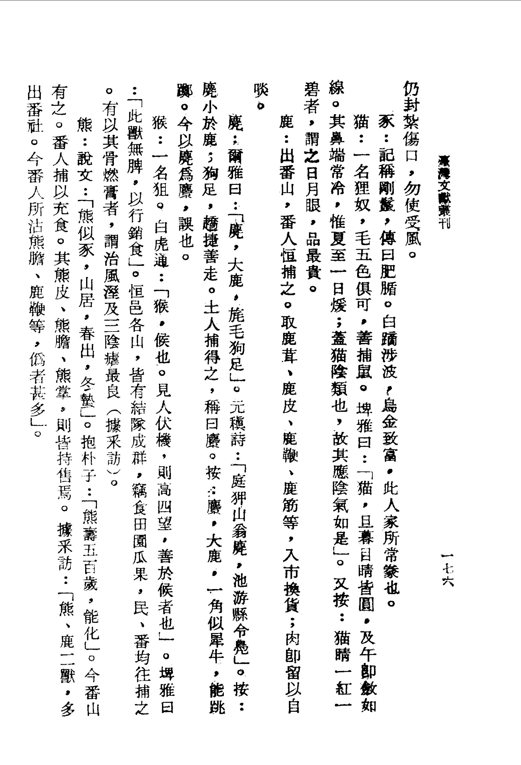 猴:一名狙.白虎通:「猴,候也.見人伏機,則高四望,善於候者也」.埤雅曰:「此獸無脾,以行銷食」.恆邑各山,皆有結隊成群,竊食田園瓜果,民、番均往捕之.有以其骨燃膏者,謂治風溼及三陰瘧最良(據釆訪)。