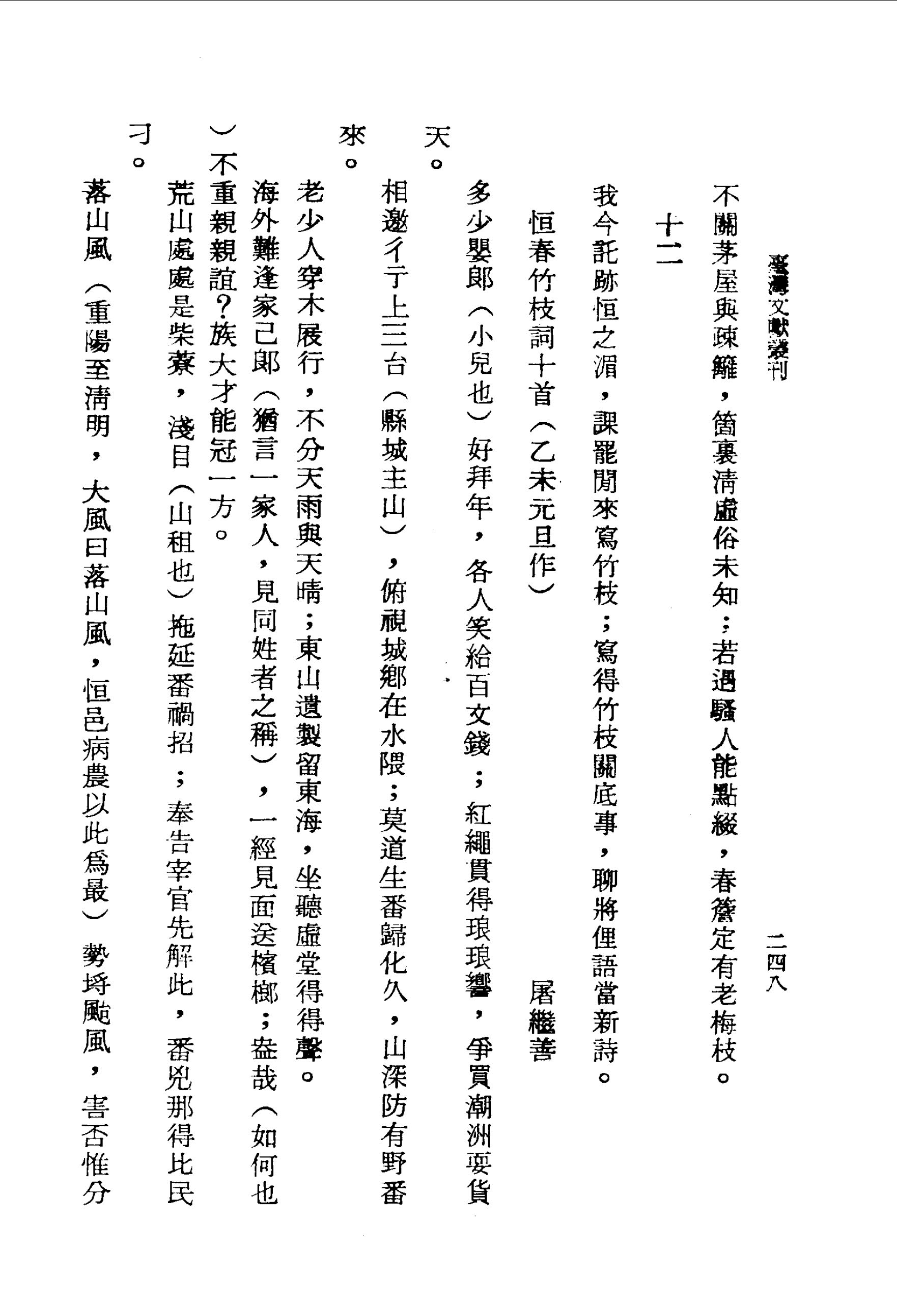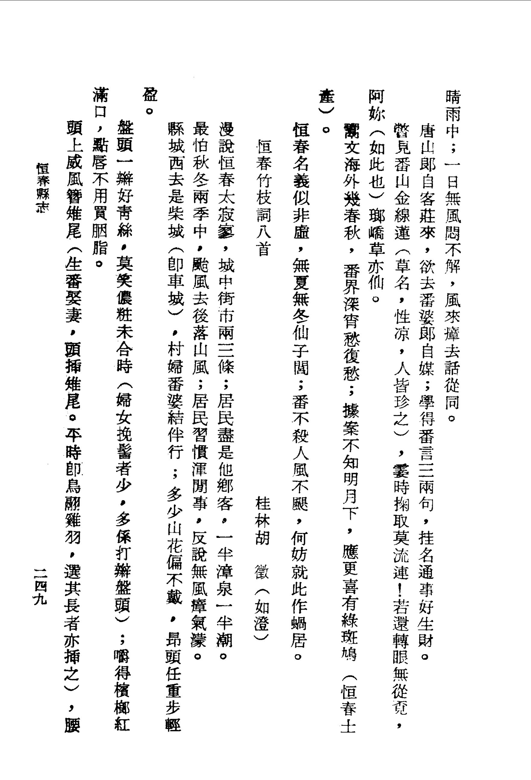 落山風(重陽至清明,大風曰落山風,恆邑病農以此為最)勢埒颱風,害否惟分晴雨中;一日無風悶不解,風來瘴去話從同。