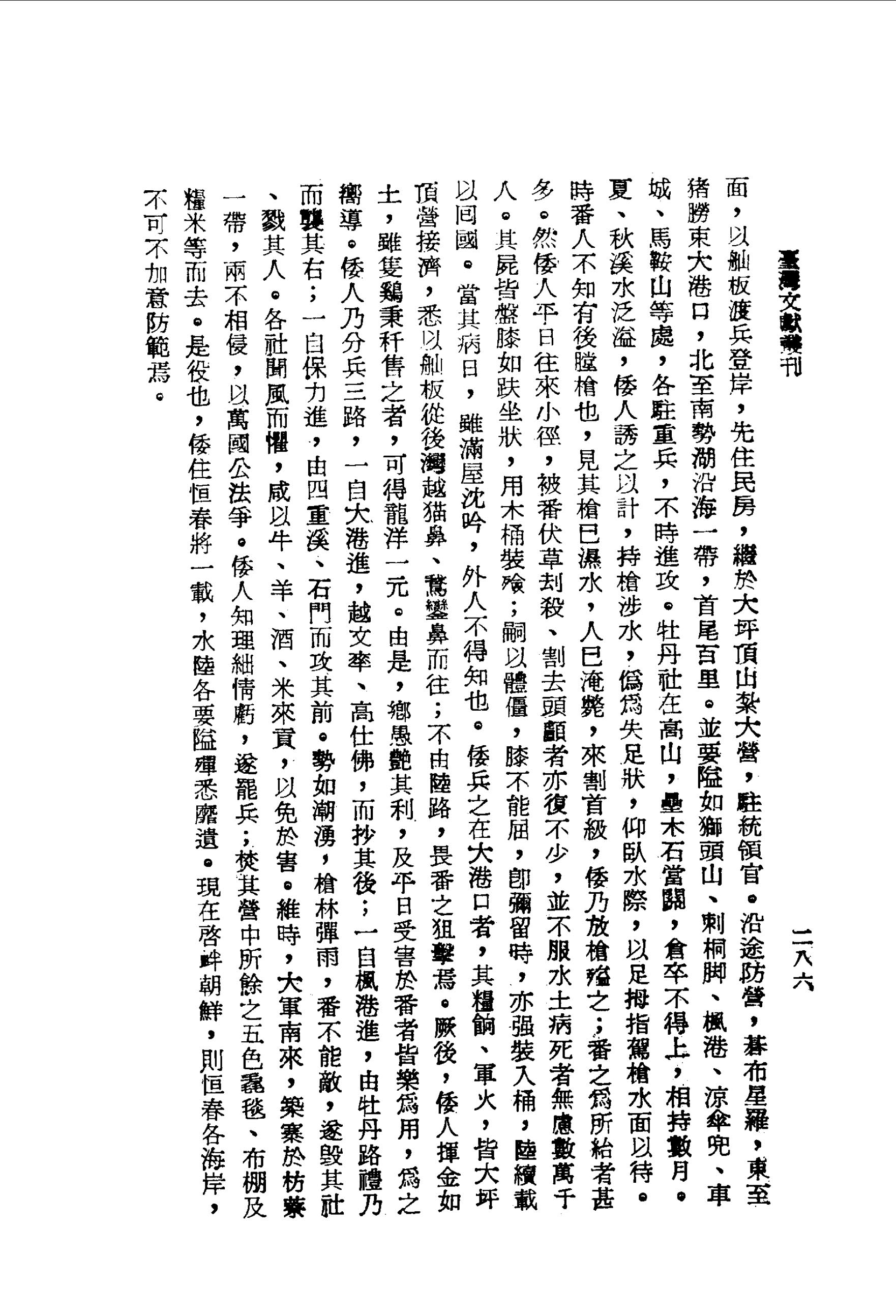 然倭人平日往來小徑,被番伏草劫殺、割去頭顱者亦復不少,並不服水土病死者無慮數萬千人.其屍皆盤膝如趺坐狀,用木桶裝殮;嗣以體僵,膝不能屈,即彌留時,亦強裝入桶,陸續載以回國.當其病日,雖滿屋沈吟,外人不得知也。 倭兵之在大港口者,其糧餉、軍火,皆大坪頂營接濟,悉以舢板從後灣越貓鼻、鵝鑾鼻而往;不由陸路,畏番之狙擊焉