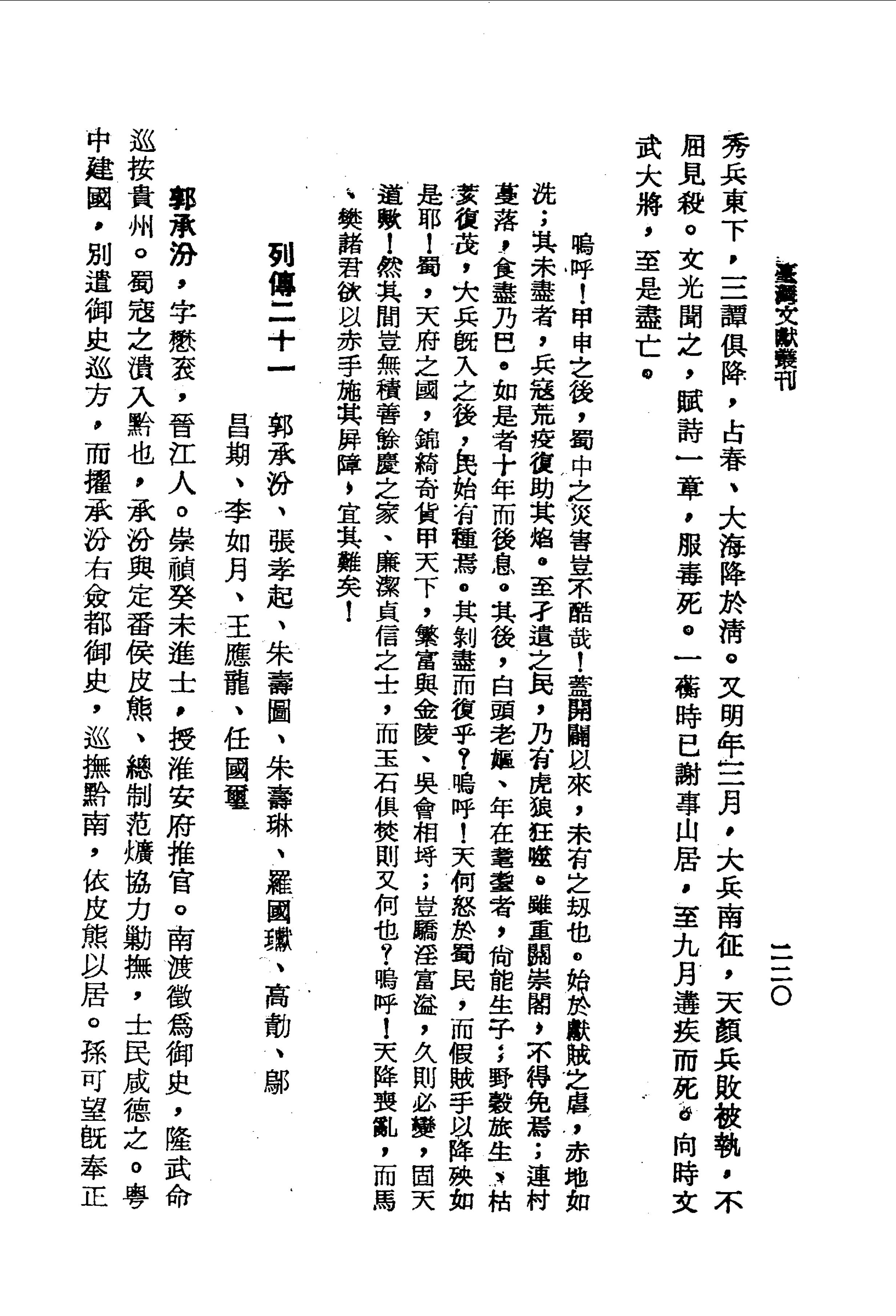 嗚呼!甲申之後,蜀中之災害豈不酷哉!蓋開闢以來,未有之劫也。始於獻賊之虐,赤地如洗;其未盡者,兵寇荒疫復助其焰。至孑遺之民,乃有虎狼狂噬。雖重關崇閣,不得免焉;連村蔓落,食盡乃已。如是者十年而後息。其後,白頭老嫗、年在耄耋者,尚能生子;野穀旅生、枯荄復茂,大兵既入之後,民始有種焉。其剝盡而復乎?嗚呼!天何怒於蜀民,而假賊手以降殃如是耶!蜀,天府之國,錦綺奇貨甲天下,繁富與金陵、吳會相埒;豈驕淫富溢,久則必變,固天道歟!然其間豈無積善餘慶之家、廉潔貞信之士,而玉石俱焚則又何也?嗚呼!天降喪亂,而馬、樊諸君欲以赤手施其屏障,宜其難矣!