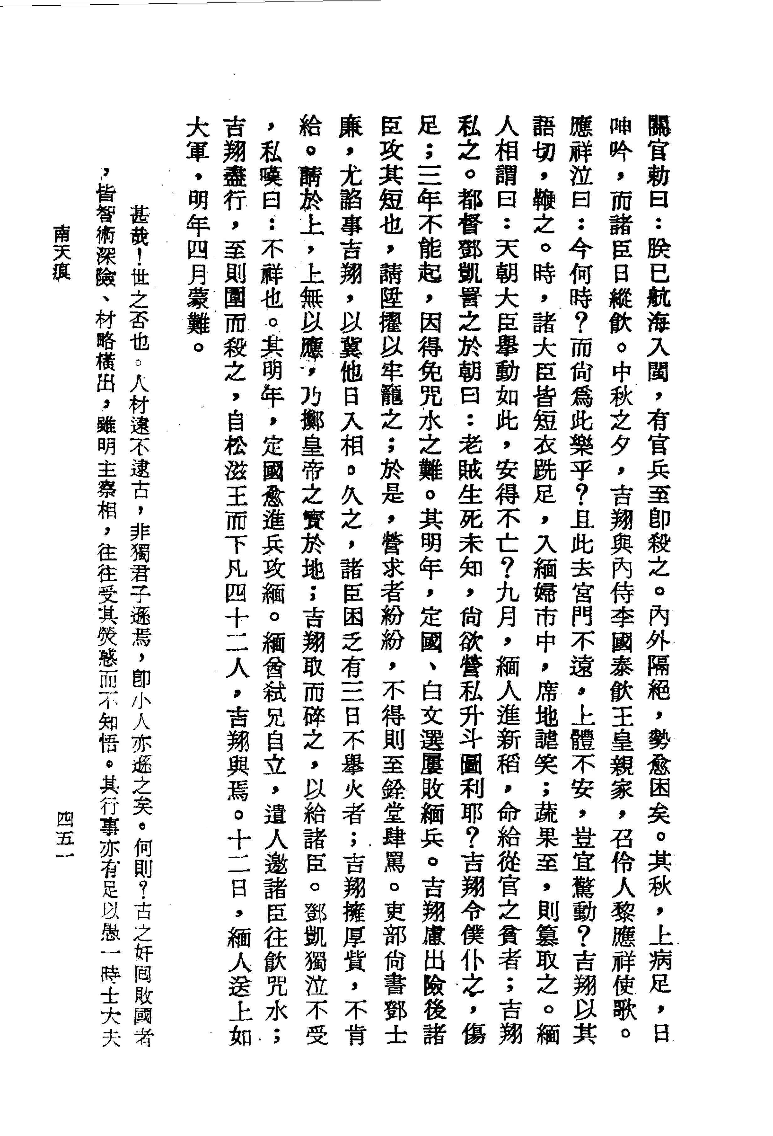 朕已航海入閩,有官兵至即殺之。內外隔絕,勢愈困矣。其秋,上病足,日呻吟,而諸臣日縱飲。中秋之夕,吉翔與內侍李國泰飲王皇親家,召伶人黎應祥使歌。應祥泣曰:今何時?而尚為此樂乎?且此去宮門不遠,上體不安,豈宜驚動?吉翔以其語切,鞭之。