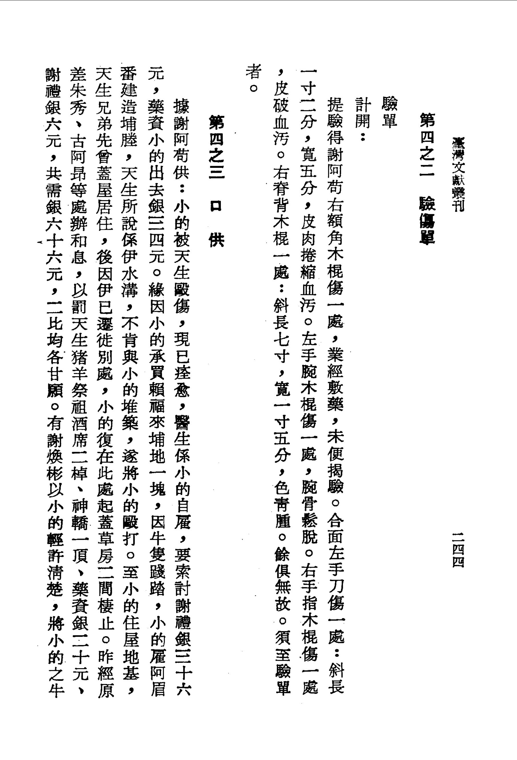 提驗得謝阿苟右額角木棍傷一處,業經敷藥,未便揭驗。合面左手刀傷一處:斜長一寸二分,寬五分,皮肉捲縮血污。左手腕木棍傷一處,腕骨鬆脫。右手指木棍傷一處,皮破血污。右脊背木棍一處:斜長七寸,寬一寸五分,色青腫。餘俱無故。須至驗單者。