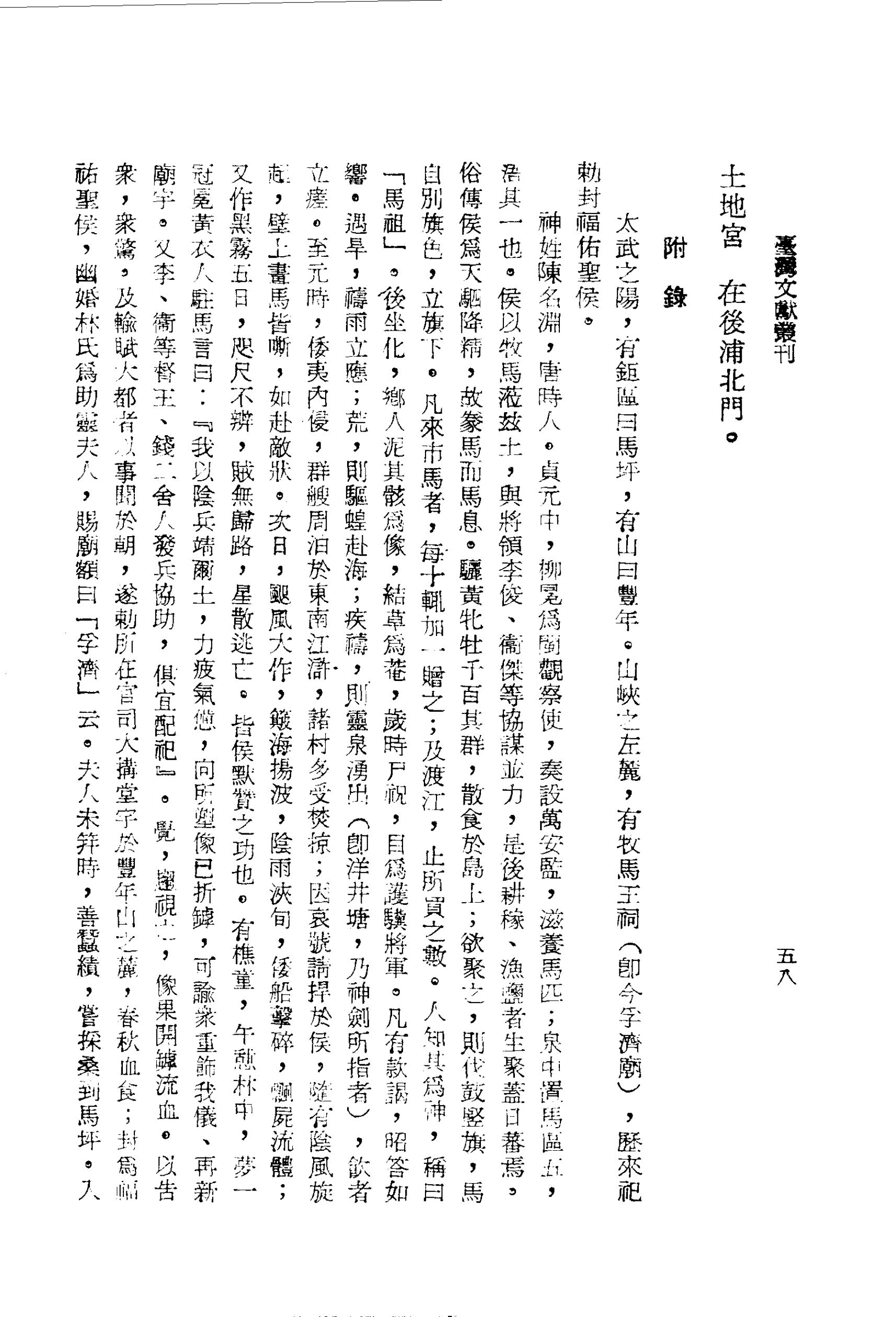 神姓陳名淵,唐時人。貞元中,柳冕為閩觀察使,奏設萬安監,滋養馬匹;泉中置馬區五,浯其一也。侯以牧馬蒞茲土,與將領李俊、衛傑等協謀並力,是後耕稼、漁鹽者生聚蓋日蕃焉。俗傳侯為天駟降精,故豢馬而馬息。驪黃牝牡千百其群,散食於島上;欲聚之,則伐鼓豎旗,馬自別旗色,立旗下。凡來市馬者,每十輒加一贈之;及渡江,止所買之數。人知其為神,稱曰「馬祖」。後坐化,鄉人泥其骸為像,結草為菴,歲時尸祝,目為護驥將軍。凡有款謁,昭答如響。遇旱,禱雨立應;荒,則驅蝗赴海;疾禱,則靈泉湧出(即洋井塘,乃神劍所指者),飲者立瘥。