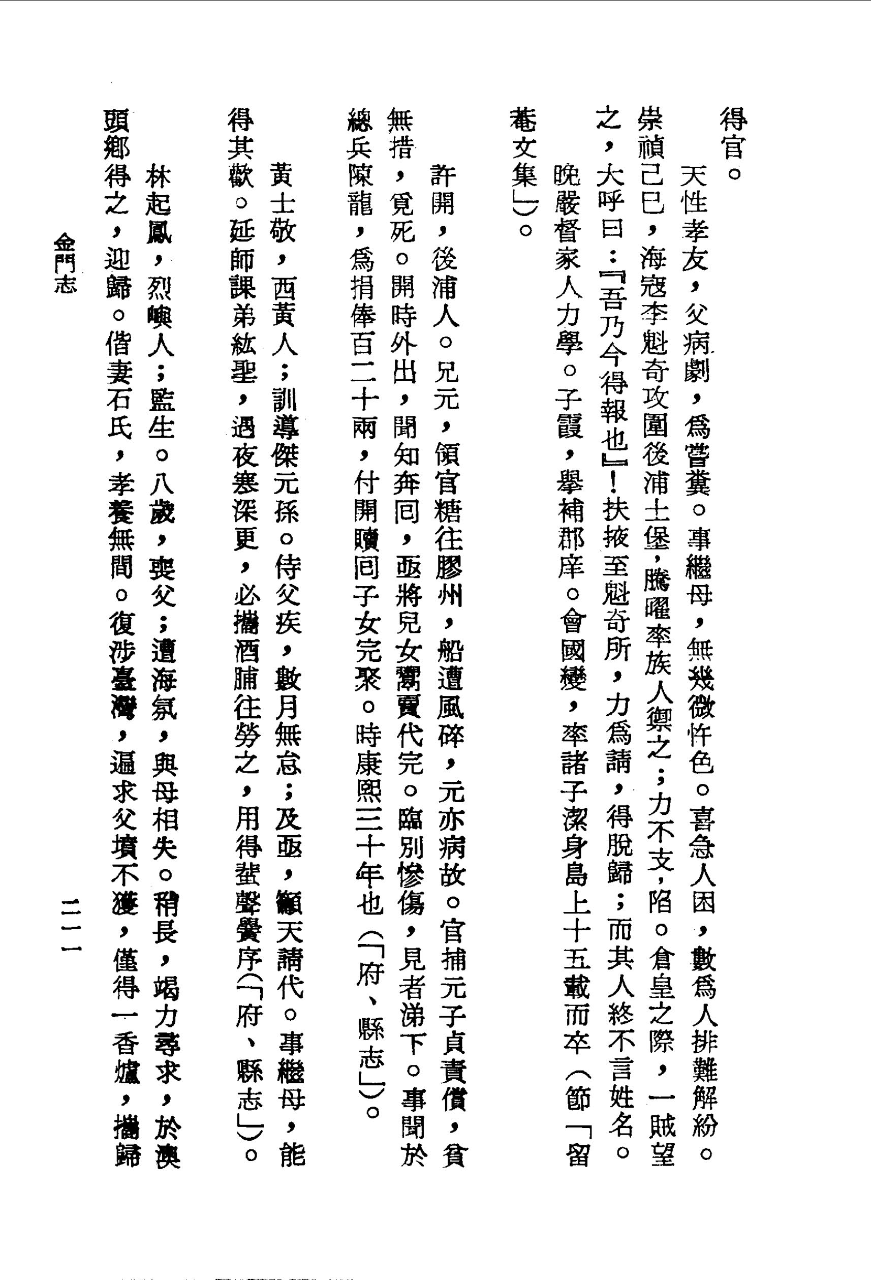 天性孝友,父病劇,為嘗糞。事繼母,無幾微忤色。喜急人困,數為人排難解紛。崇禎己巳,海寇李魁奇攻圍後浦土堡,騰曜率族人禦之;力不支,陷。倉皇之際,一賊望之,大呼曰:『吾乃今得報也』!扶掖至魁奇所,力為請,得脫歸;而其人終不言姓名。