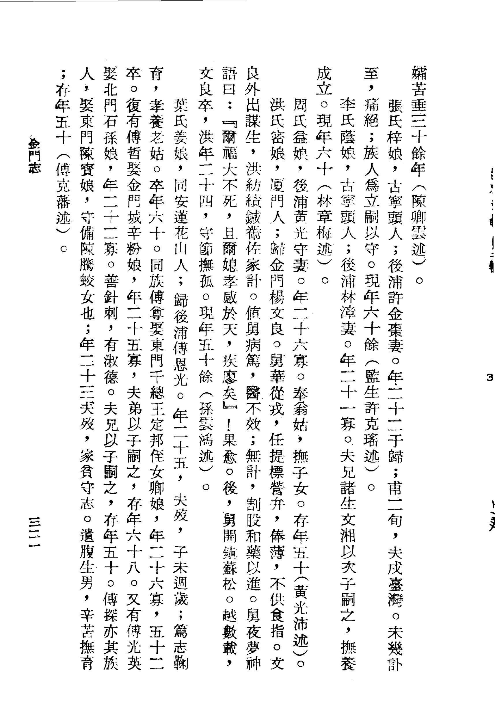 洪氏密娘,廈門人;歸金門楊文良。舅華從戎,任提標營弁,俸薄,不供食指。文良外出謀生,洪紡績鍼黹佐家計。值舅病篤,醫不效;無計,割股和藥以進。舅夜夢神語曰:『爾福大不死,且爾媳孝感於天,疾瘳矣』!果愈。後,舅開鎮蘇松。越數載,文良卒,洪年二十四,守節撫孤。現年五十餘(孫雲鴻述)。