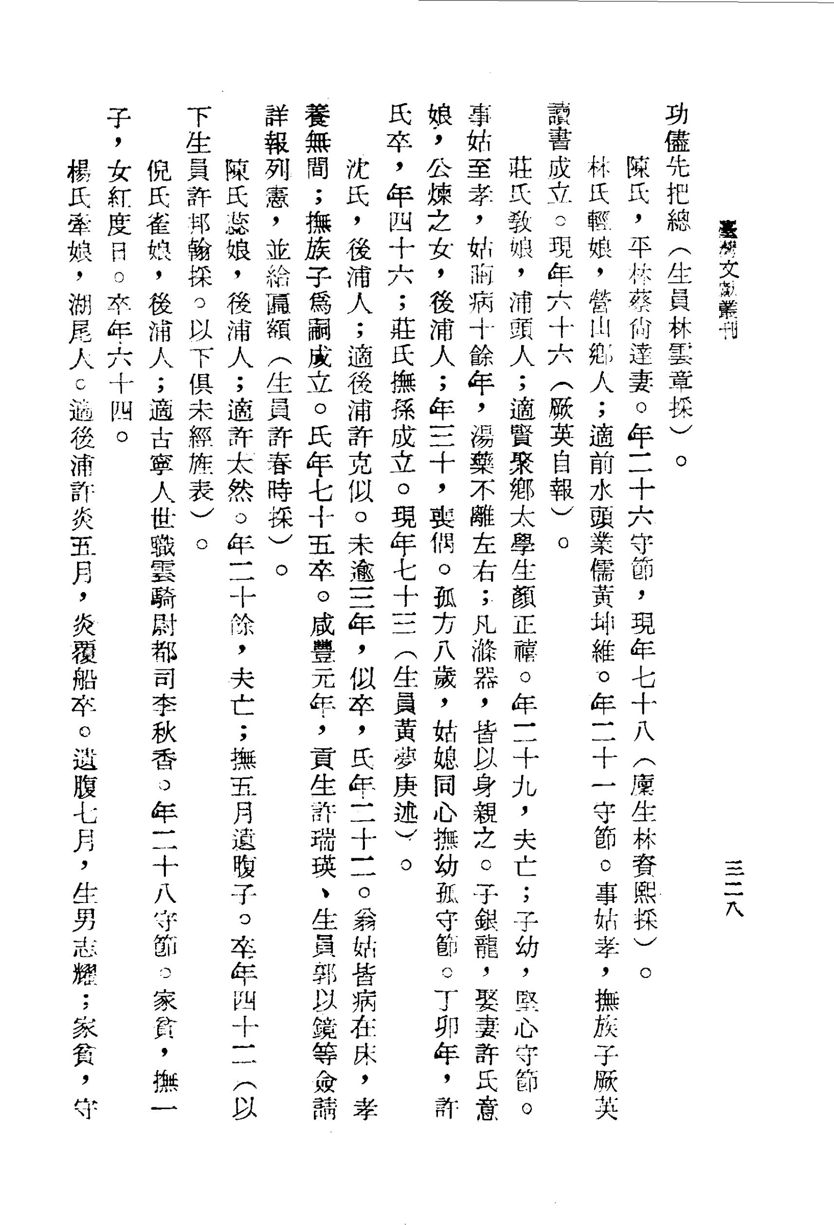 莊氏教娘,浦頭人;適賢聚鄉太學生顏正禧。年二十九,夫亡;子幼,堅心守節。事姑至孝,姑晦病十餘年,湯藥不離左右;凡滌器,皆以身親之。子銀龍,娶妻許氏意娘,公煉之女,後浦人;年三十,喪偶。孤方八歲,姑媳同心撫幼孤守節。丁卯年,許氏卒,年四十六;莊氏撫孫成立。現年七十三(生員黃夢庚述)。