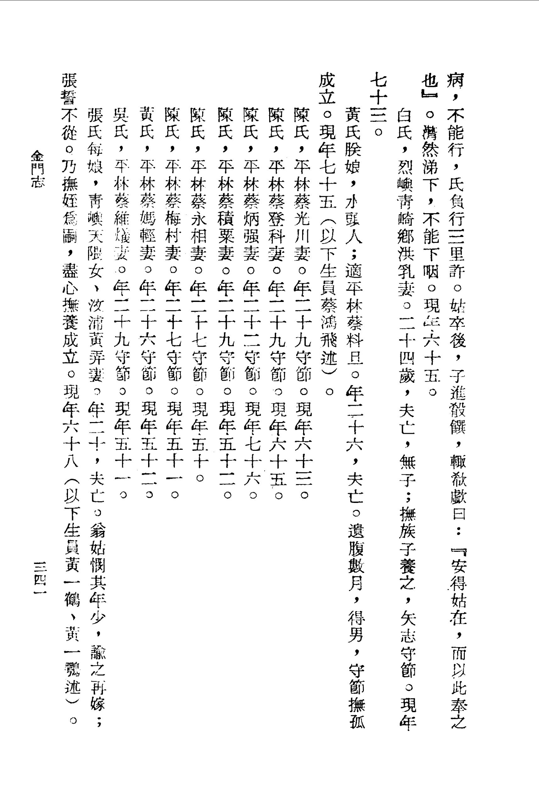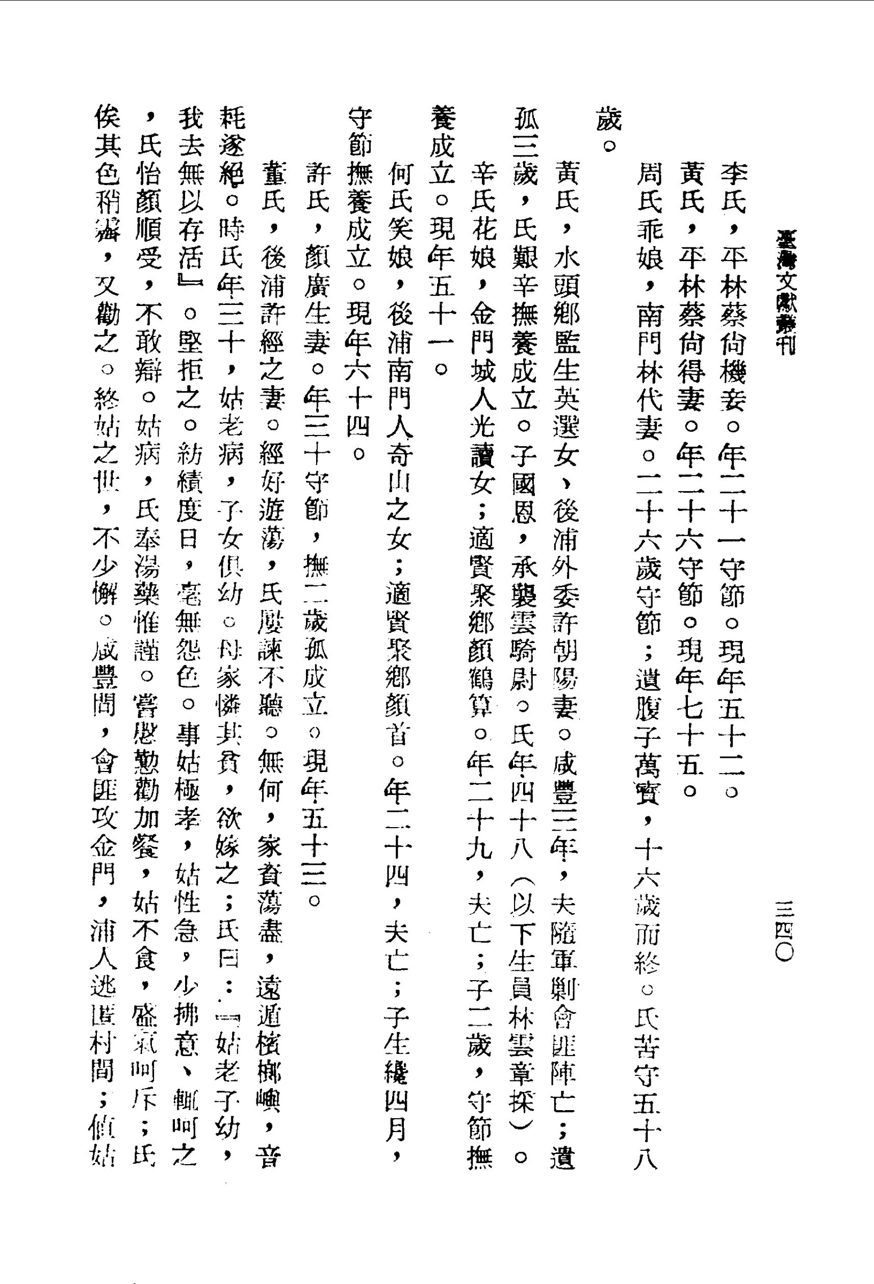 董氏,後浦許經之妻。經好遊蕩,氏屢諫不聽。無何,家資蕩盡,遠遁檳榔嶼,音耗遂絕。時氏年三十,姑老病,子女俱幼。母家憐其貧,欲嫁之;氏曰:『姑老子幼,我去無以存活』。堅拒之。紡績度日,毫無怨色。事姑極孝,姑性急,少拂意、輒呵之,氏怡顏順受,不敢辯。姑病,氏奉湯藥惟謹。嘗慇懃勸加餐,姑不食,盛氣呵斥;氏俟其色稍霽,又勸之。終姑之世,不少懈。咸豐間,會匪攻金門,浦人逃匿村間;值姑病,不能行,氏負行三里許。姑卒後,子進殽饌,輒欷歔曰:『安得姑在,而以此奉之也』。潸然涕下,不能下咽。現年六十五。