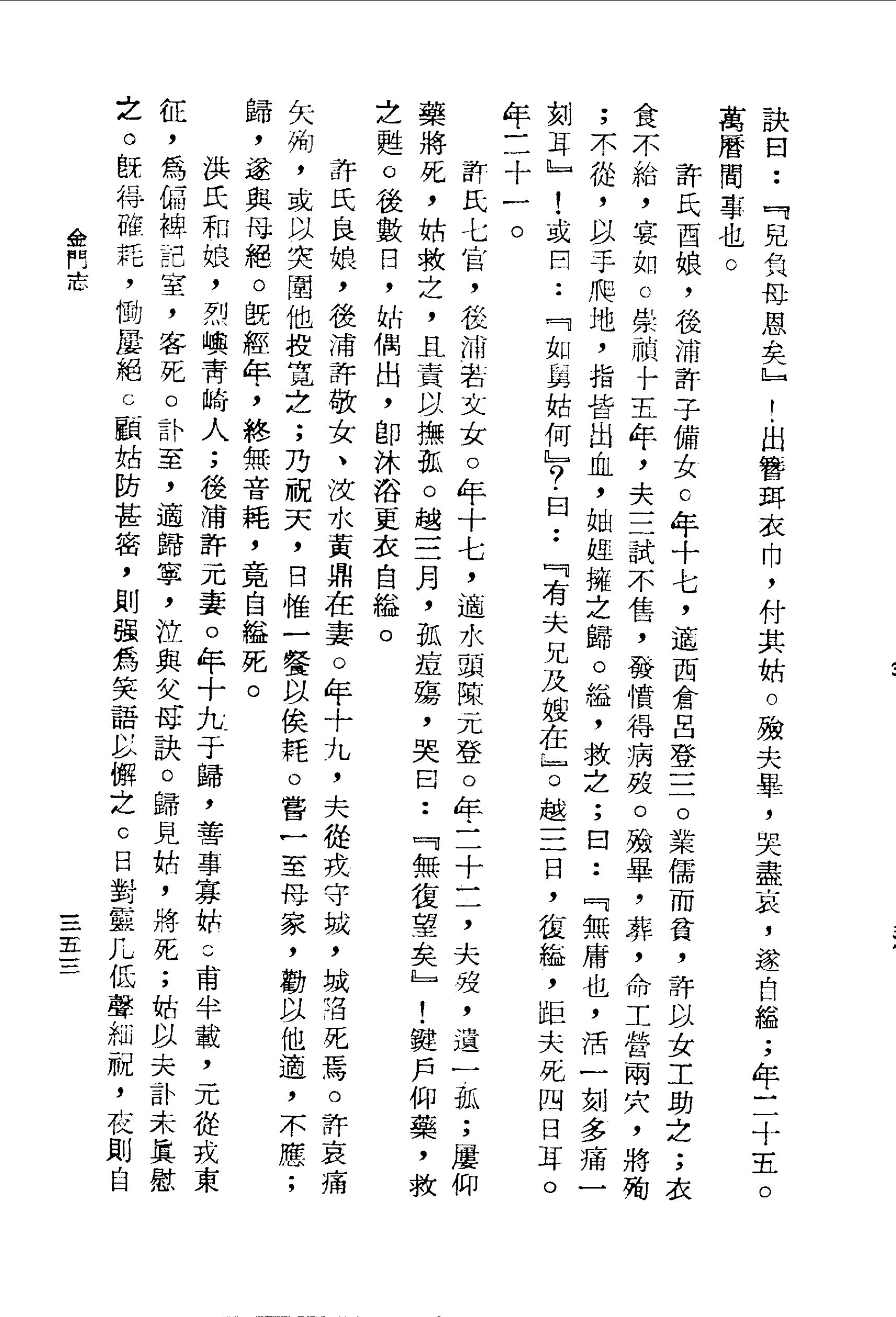 許氏七官,後浦若文女。年十七,適水頭陳元登。年二十二,夫歿,遺一孤;屢仰藥將死,姑救之,且責以撫孤。越三月,孤痘殤,哭曰:『無復望矣』!鍵戶仰藥,救之甦。後數日,姑偶出,即沐浴更衣自縊。