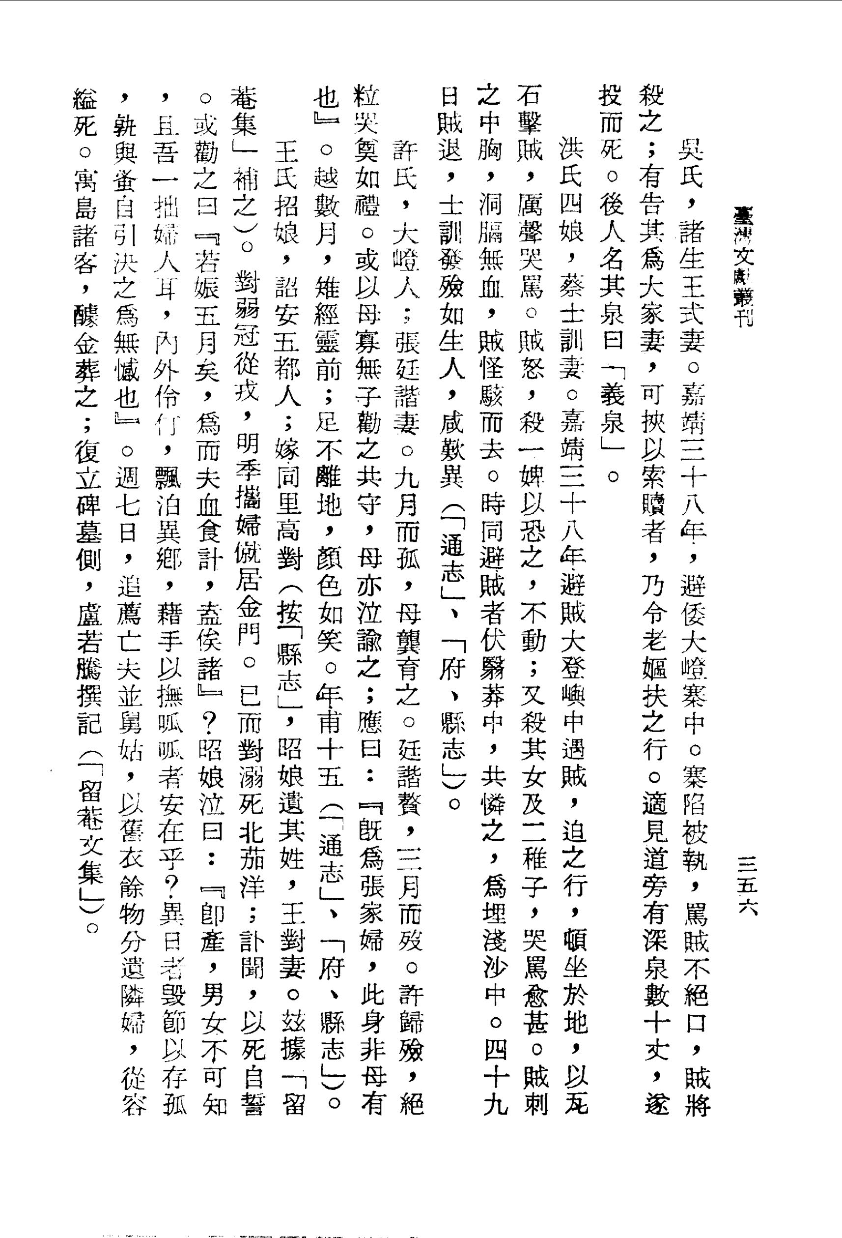 洪氏四娘,蔡士訓妻。嘉靖三十八年避賊大登嶼中遇賊,迫之行,頓坐於地,以瓦石擊賊,厲聲哭罵。賊怒,殺一婢以恐之,不動;又殺其女及二稚子,哭罵愈甚。賊刺之中胸,洞膈無血,賊怪駭而去。時同避賊者伏翳莽中,共憐之,為埋淺沙中。四十九日賊退,士訓發殮如生人,咸歎異(「通志」、「府、縣志」)。